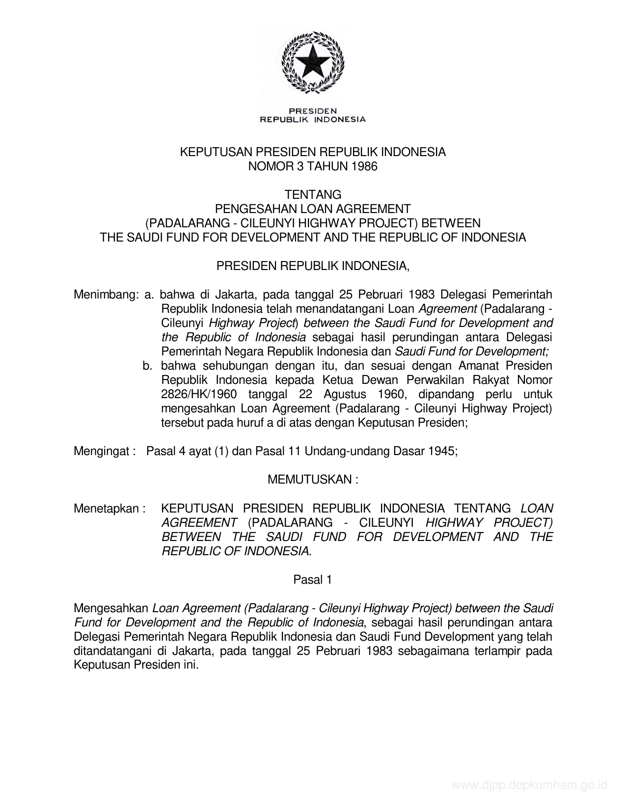 KEPPRES Nomor 3 Tahun 1986 | Keputusan Presiden Nomor 3 Tahun 1986 tentang PENGESAHAN LOAN AGREEMENT (PADALARANG,CILEUNYI HIGHWAY PROJECT) BETWEEN THE SAUDI FUND FOR DEVELOPMENT AND THE REPUBLIC OF INDONESIA