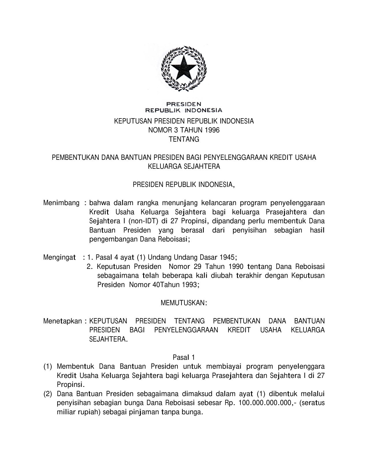 KEPPRES Nomor 3 Tahun 1996 | Keputusan Presiden Nomor 3 Tahun 1996 tentang PEMBENTUKAN DANA BANTUAN PRESIDEN BAGI PENYELENGGARAAN KREDIT USAHA KELUARGA SEJAHTERA
