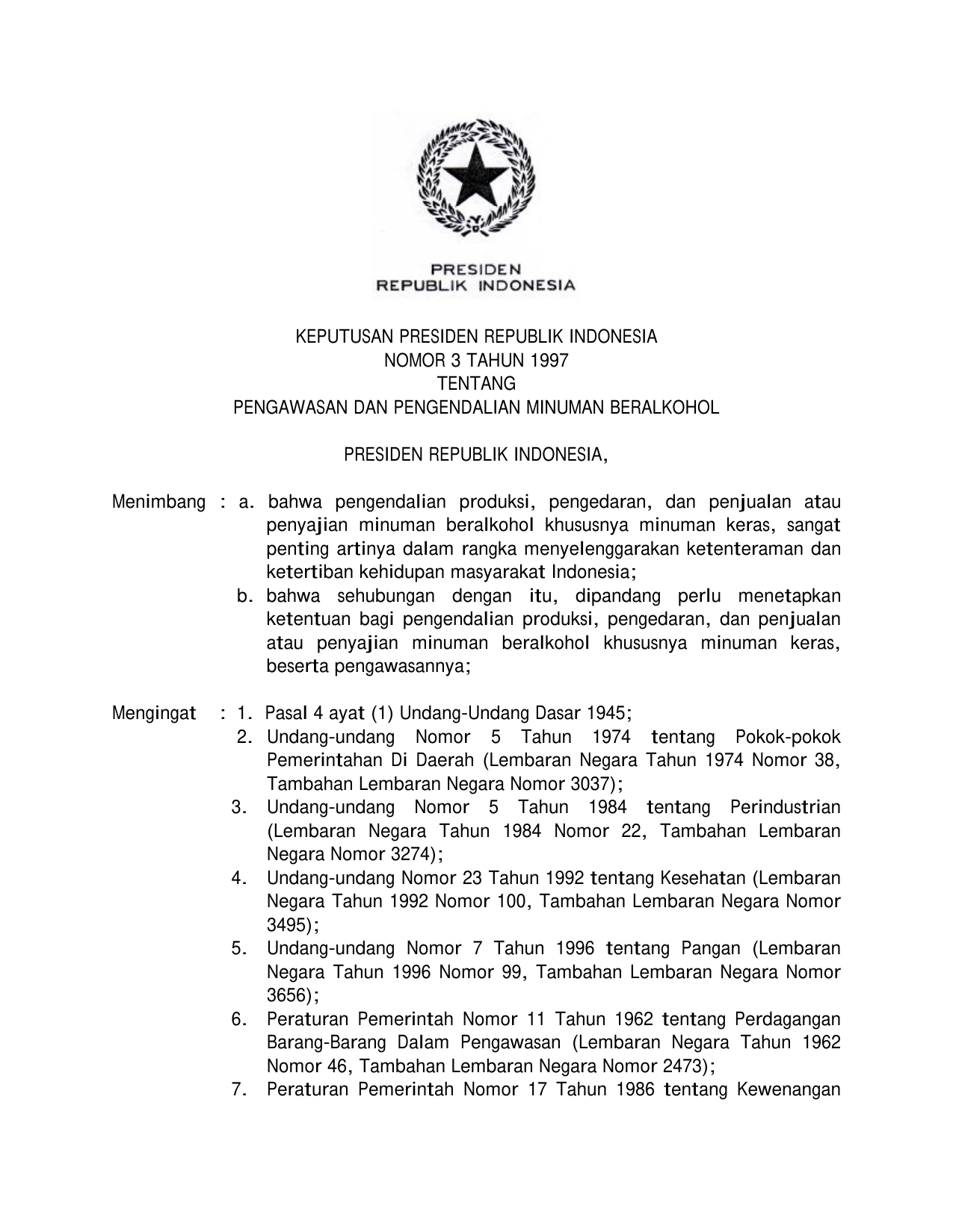 KEPPRES Nomor 3 Tahun 1997 | Keputusan Presiden Nomor 3 Tahun 1997 tentang PENGAWASAN DAN PENGENDALIAN MINUMAL BERALKOHOL