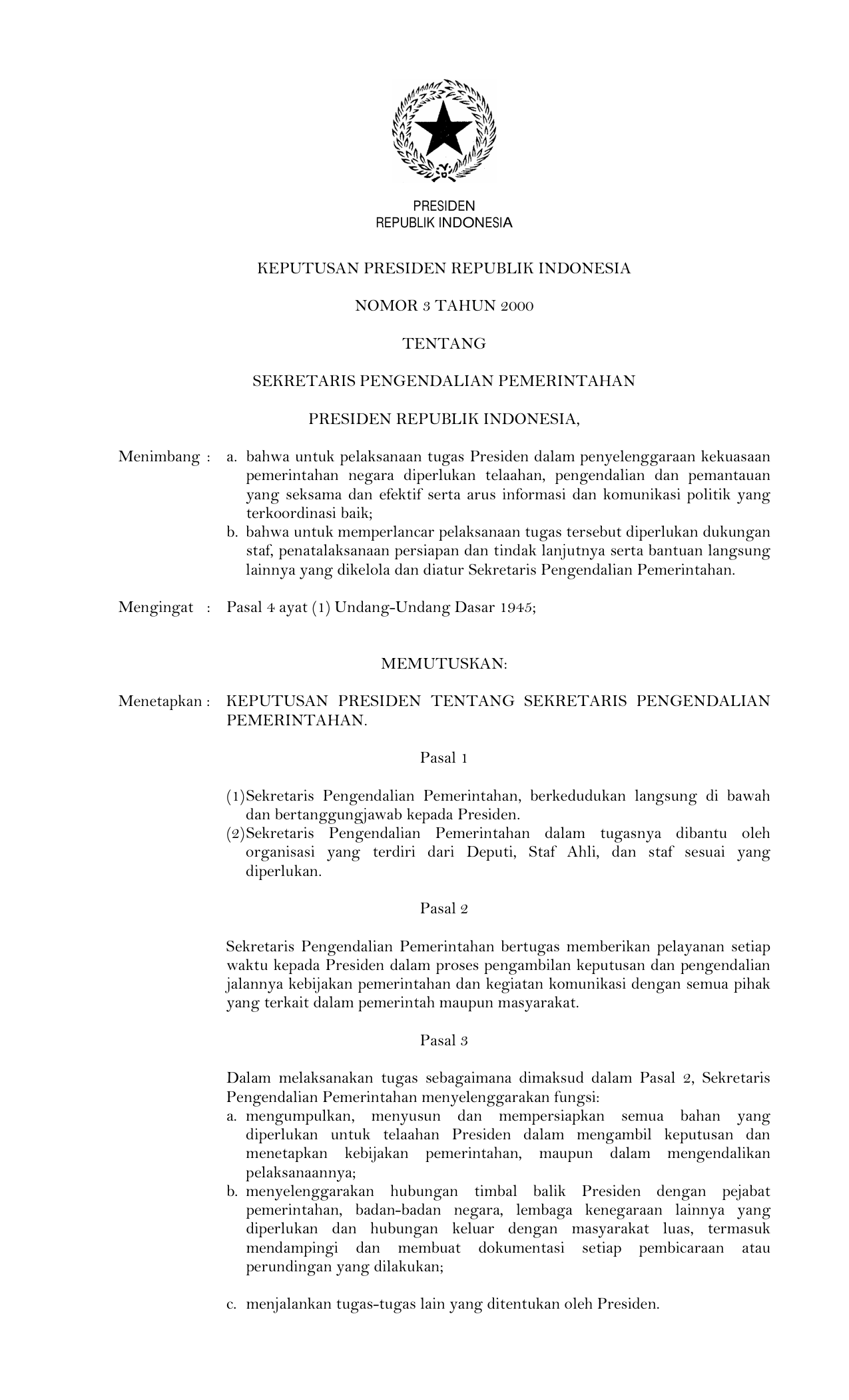 KEPPRES Nomor 3 Tahun 2000 | Keputusan Presiden Nomor 3 Tahun 2000 tentang SEKRETARIS PENGENDALIAN PEMERINTAHAN