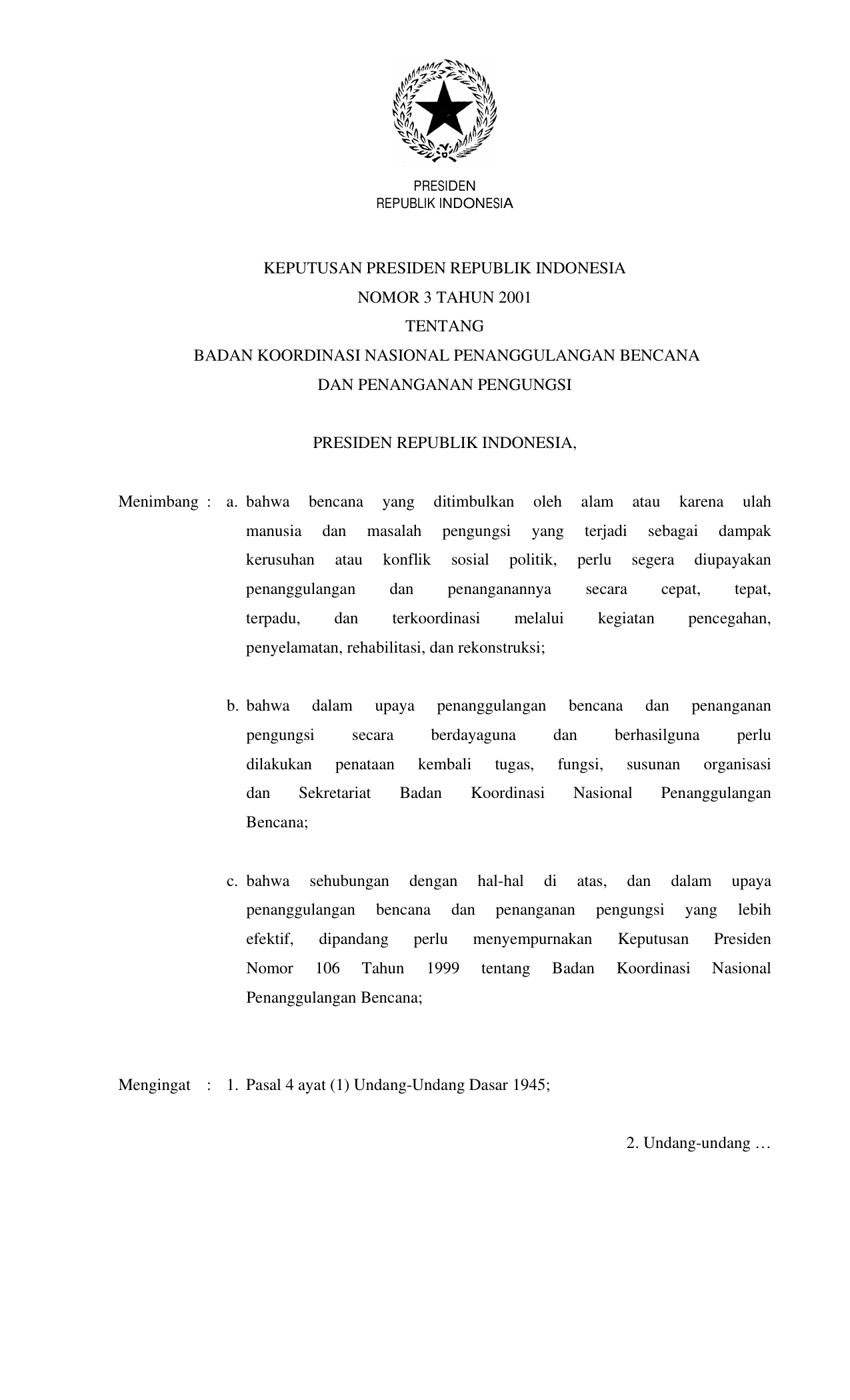 KEPPRES Nomor 3 Tahun 2001 | Keputusan Presiden Nomor 3 Tahun 2001 tentang BADAN KOORDINASI NASIONAL PENANGGULANGAN BENCANA DAN PENANGANAN PENGUNGSI