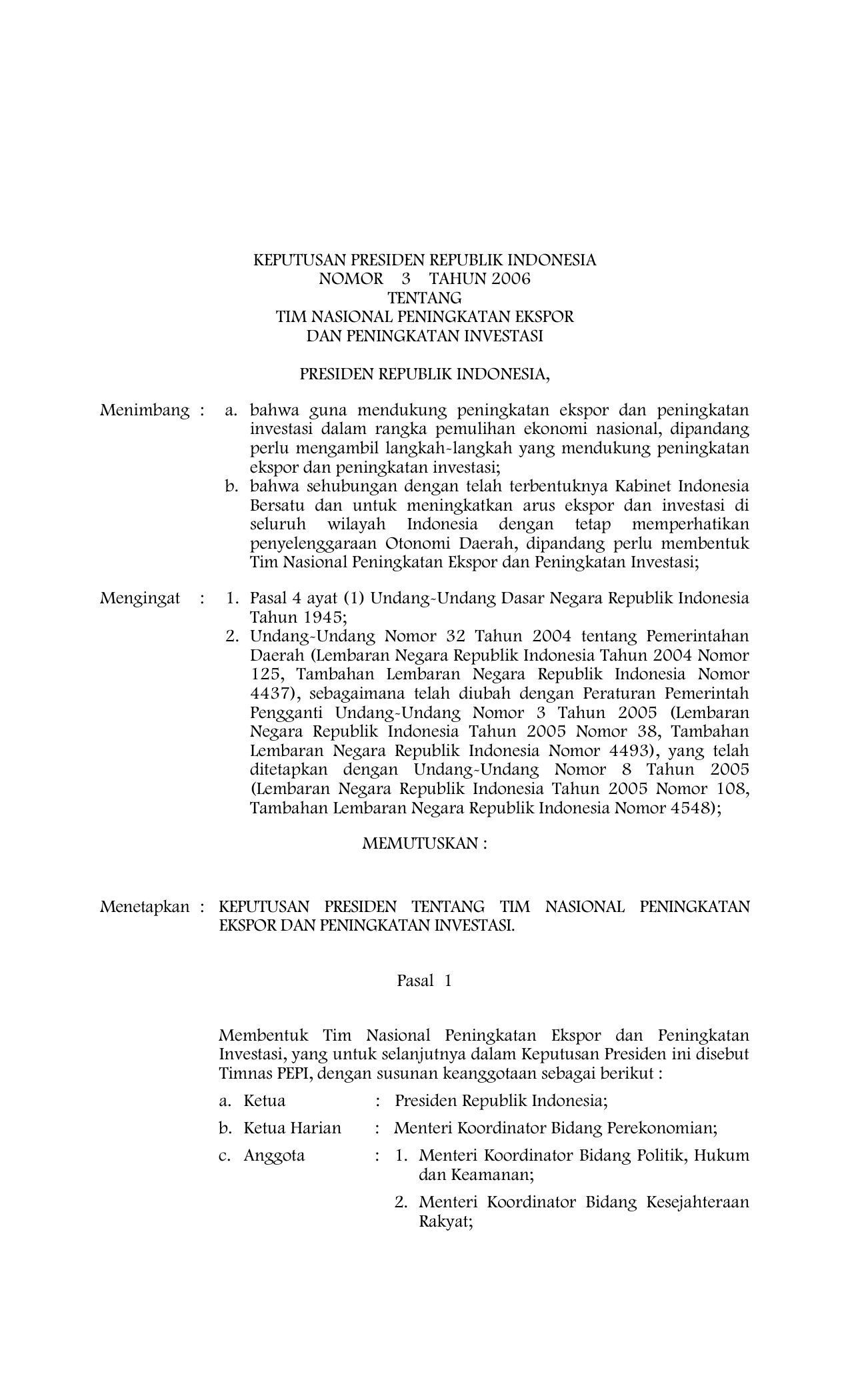 KEPPRES Nomor 3 Tahun 2006 | Keputusan Presiden Nomor 3 Tahun 2006 tentang TIM NASIONAL PENINGKATAN EKSPOR DAN PENINGKATAN INVESTASI