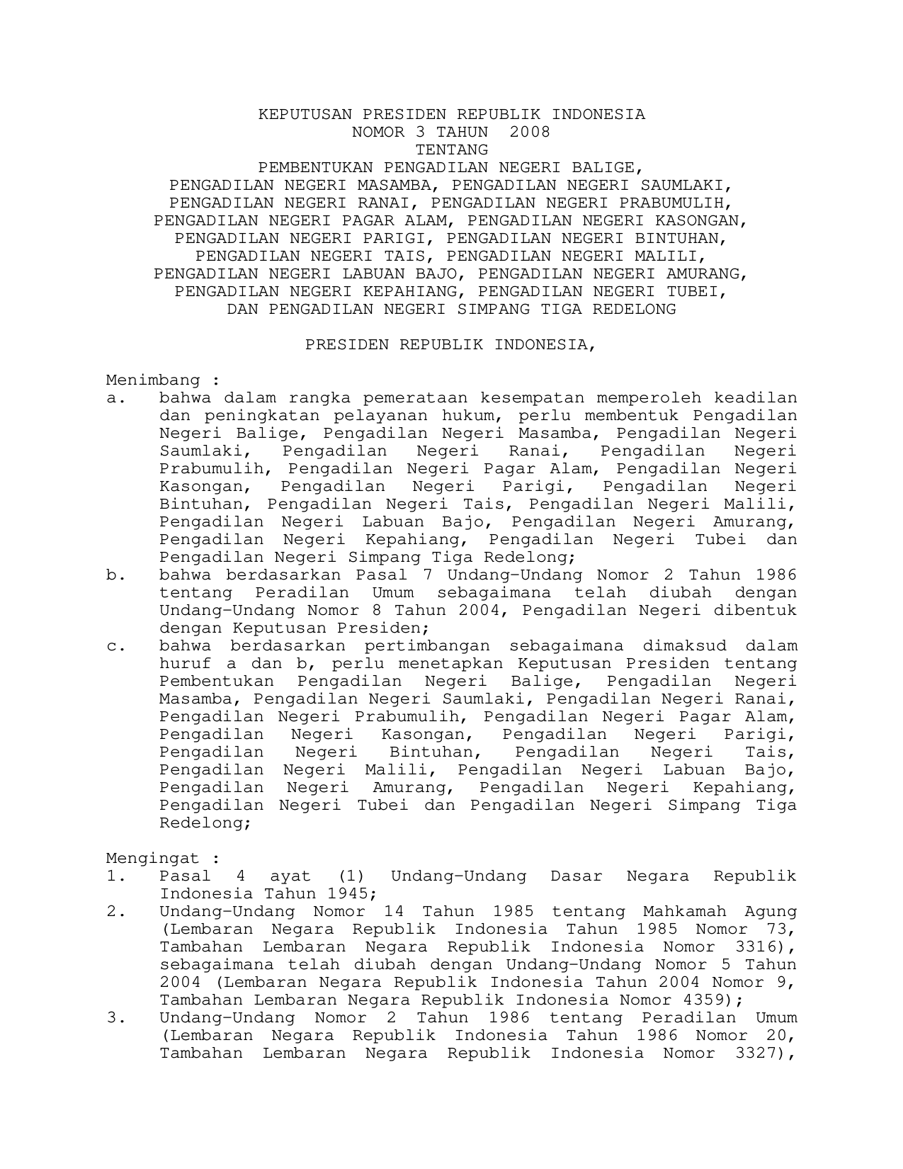 KEPPRES Nomor 3 Tahun 2008 | Keputusan Presiden Nomor 3 Tahun 2008 tentang PEMBENTUKAN PENGADILAN NEGERI BALIGE, PENGADILAN NEGERI MASAMBA, PENGADILAN NEGERI SAUMLAKI, PENGADILAN NEGERI RANAI, PENGADILAN NEGERI PRABUMULIH, PENGADILAN NEGERI PAGAR ALAM, PENGADILAN NEGERI KASONGAN, PENGADILAN NEGERI PARIGI, PENGADILAN NEGERI BINTUHAN, PENGADILAN NEGERI TAIS, PENGADILAN NEGERI MALILI, PENGADILAN NEGERI LABUAN BAJO, PENGADILAN NEGERI AMURANG, PENGADILAN NEGERI KEPAHIANG, PENGADILAN NEGERI TUBEI, DAN PENGADILAN NEGERI SIMPANG TIGA REDELONG