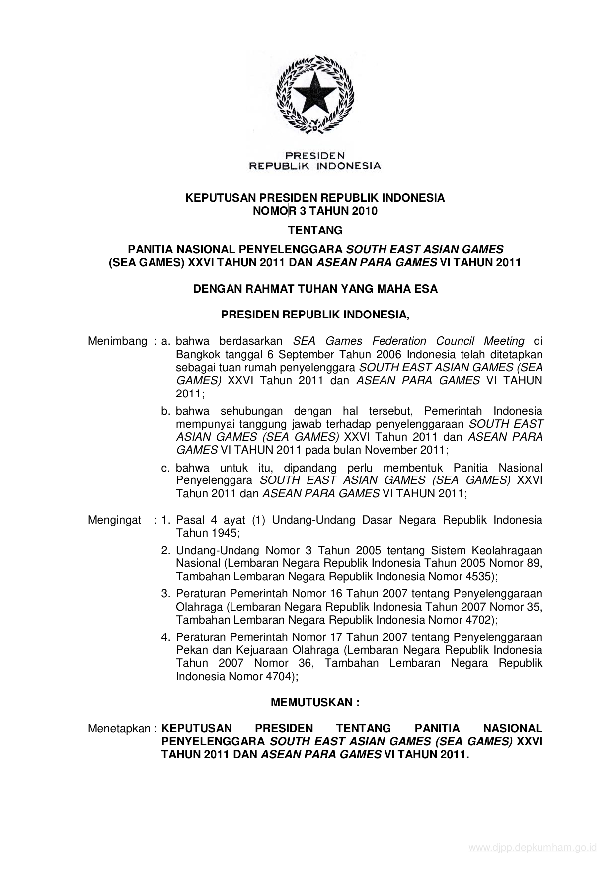 KEPPRES Nomor 3 Tahun 2010 | Keputusan Presiden Nomor 3 Tahun 2010 tentang PANITIA NASIONAL PENYELENGGARA SOUTH EAST ASIAN GAMES (SEA GAMES) XXVI TAHUN 2011 DAN ASEAN PARA GAMES VI TAHUN 2011