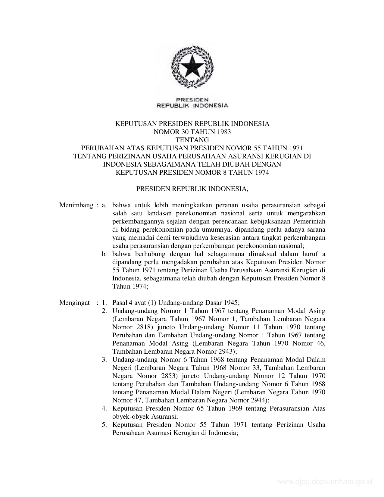 KEPPRES Nomor 30 Tahun 1983 | Keputusan Presiden Nomor 30 Tahun 1983 tentang PERUBAHAN ATAS KEPUTUSAN PRESIDEN NOMOR 55 TAHUIN 1971 TENTANG PERIZINAN USAHA PERUSAHAAN ASURANSI KERUGIAN DI INDONESIA