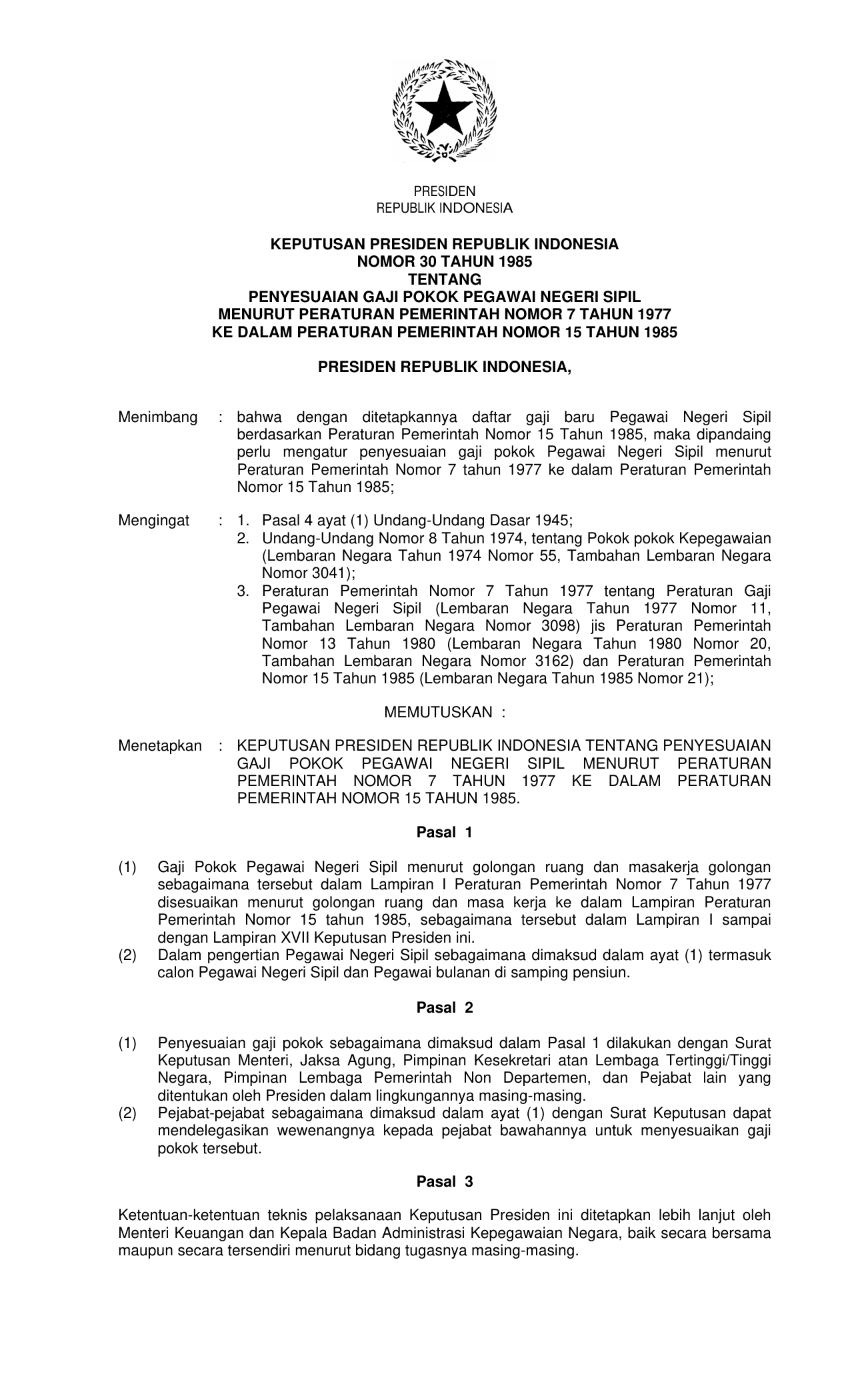 KEPPRES Nomor 30 Tahun 1985 | Keputusan Presiden Nomor 30 Tahun 1985 tentang PENYESUAIAN GAJI POKOK PEGAWAI NEGERI SIPIL MENURUT PERATURAN PEMERINTAH NOMOR 7 TAHUN 1977 KEDALAM PERATURAN PEMERINTAH NOMOR 15 TAHUN 1985