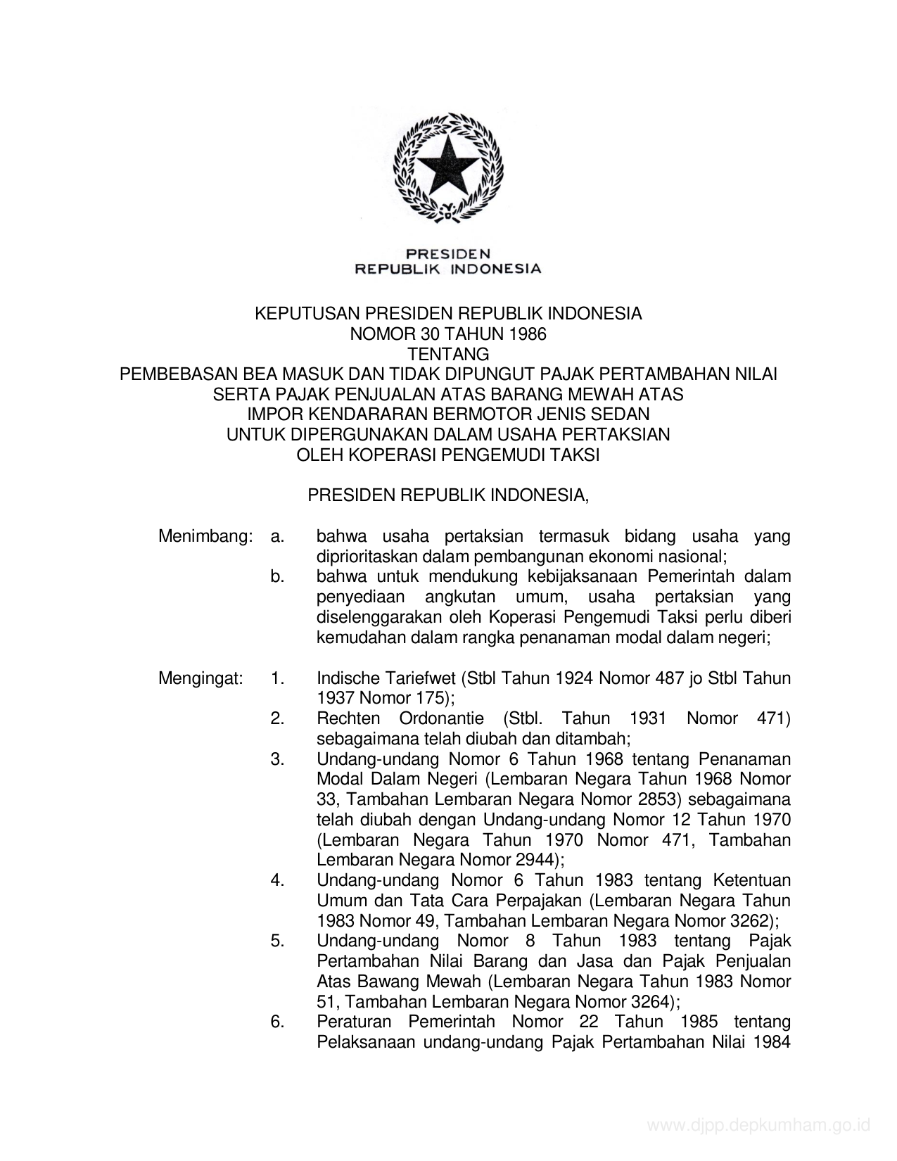 KEPPRES Nomor 30 Tahun 1986 | Keputusan Presiden Nomor 30 Tahun 1986 tentang PEMBEBASAN BIAYA MASUK DAN TIDAK DIPUNGUT PAJAK PERTAMBAHAN NILAI SERTA PAJAK PENJUALAN ATAS BARANG MEWAH ATAS IMPOR KENDARAAN BERMOTOR JENIS SEDAN UNTUK DIPERGUNAKAN DALAM USAHA PERTAKSIAN OLEH KOPERASI PENGEMUDI TAKSI