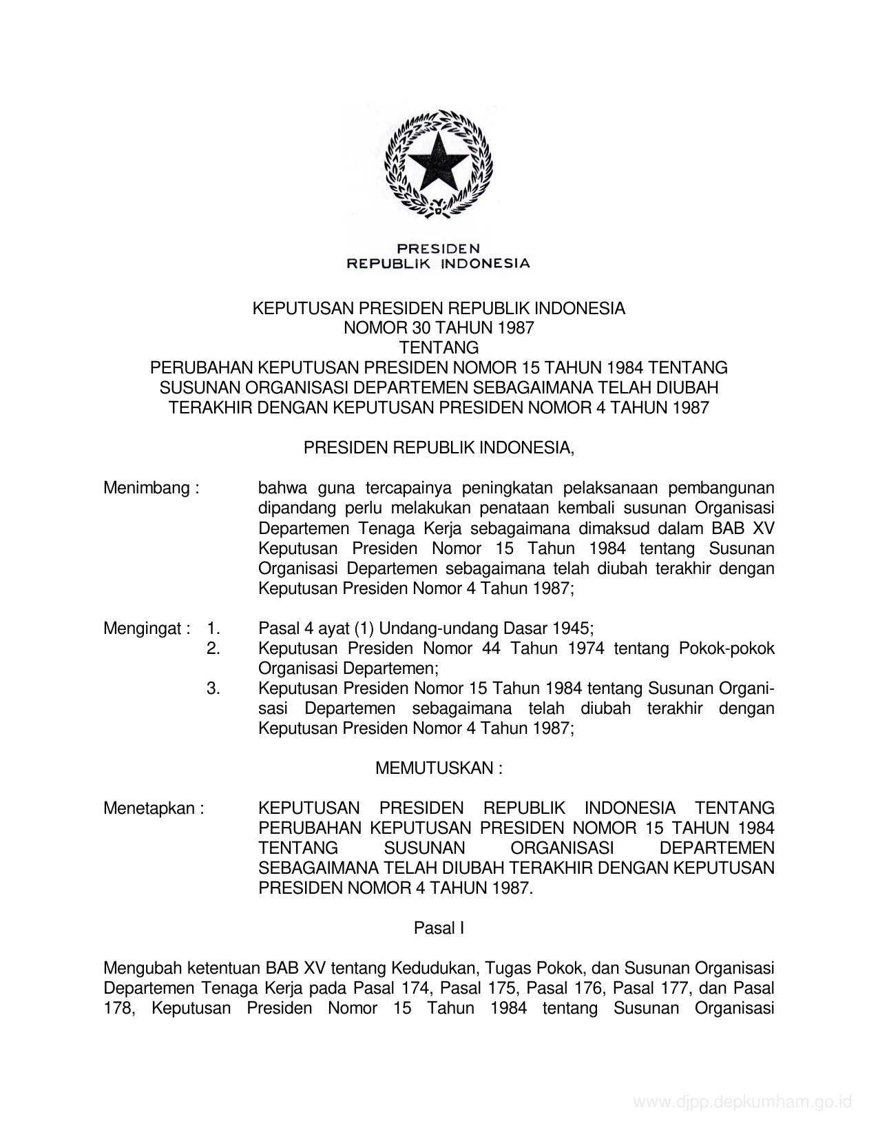 KEPPRES Nomor 30 Tahun 1987 | Keputusan Presiden Nomor 30 Tahun 1987 tentang PERUBAHAN KEPUTUSAN PRESIDEN NOMOR 15 TAHUN 1984 TENTANG SUSUNAN ORGANISASI DEPARTEMEN SEBAGAIMANA TELAH DIUBAH TERAKHIR DENGAN KEPUTUSAN PRESIDEN NOMOR 4 TAHUN 1987
