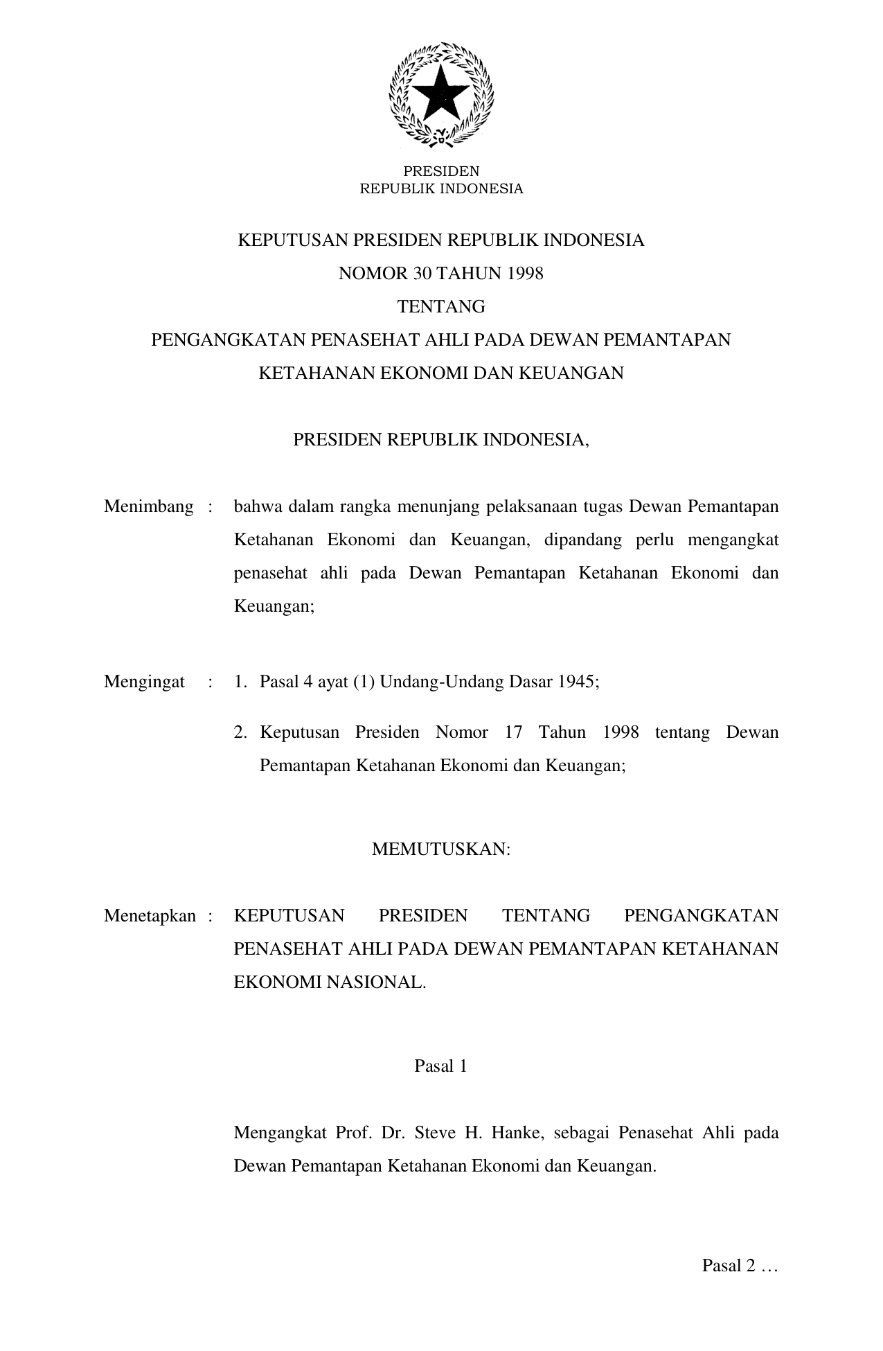 KEPPRES Nomor 30 Tahun 1998 | Keputusan Presiden Nomor 30 Tahun 1998 tentang PENGANGKATAN PENASEHAT AHLI PADA DEWAN PEMANTAPAN KETAHANAN PADA DEWAN PEMANTAPAN KETAHANAN EKONOMI