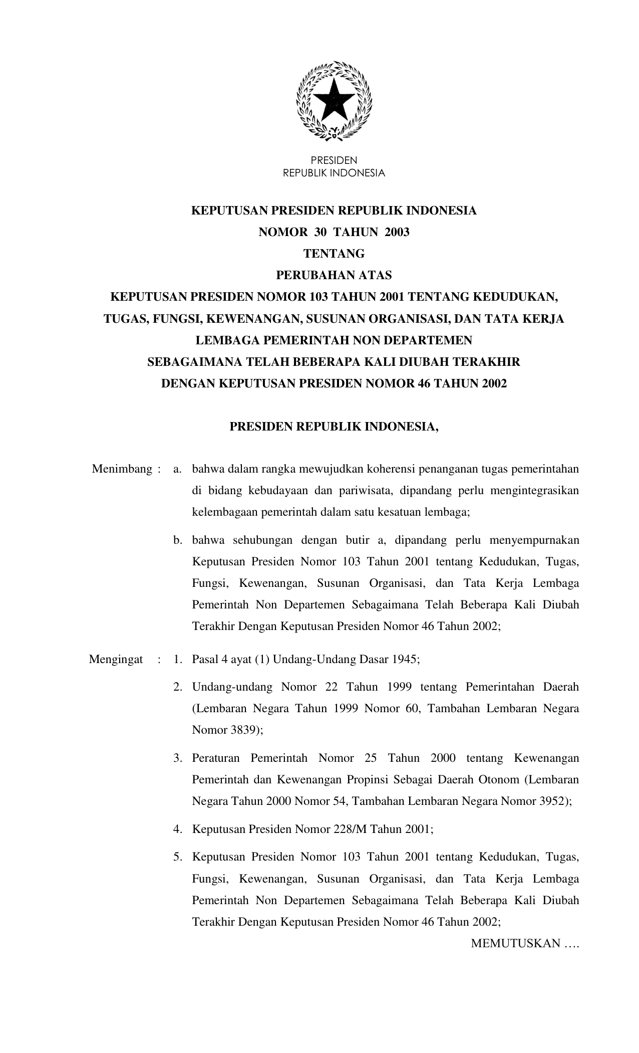 KEPPRES Nomor 30 Tahun 2003 | Keputusan Presiden Nomor 30 Tahun 2003 tentang PERUBAHAN ATAS KEPUTUSAN PRESIDEN NOMOR 103 TAHUN 2001 TENTANG KEDUDUKAN, TUGAS, FUNGSI, KEWENANGAN, SUSUNAN ORGANISASI, DAN TATA KERJA LEMBAGA PEMERINTAH NON DEPARTEMEN SEBAGAIMANA TELAH BEBERAPA KALI DIUBAH TERAKHIR DENGAN KEPUTUSAN PRESIDEN NOMOR 46 TAHUN 2002