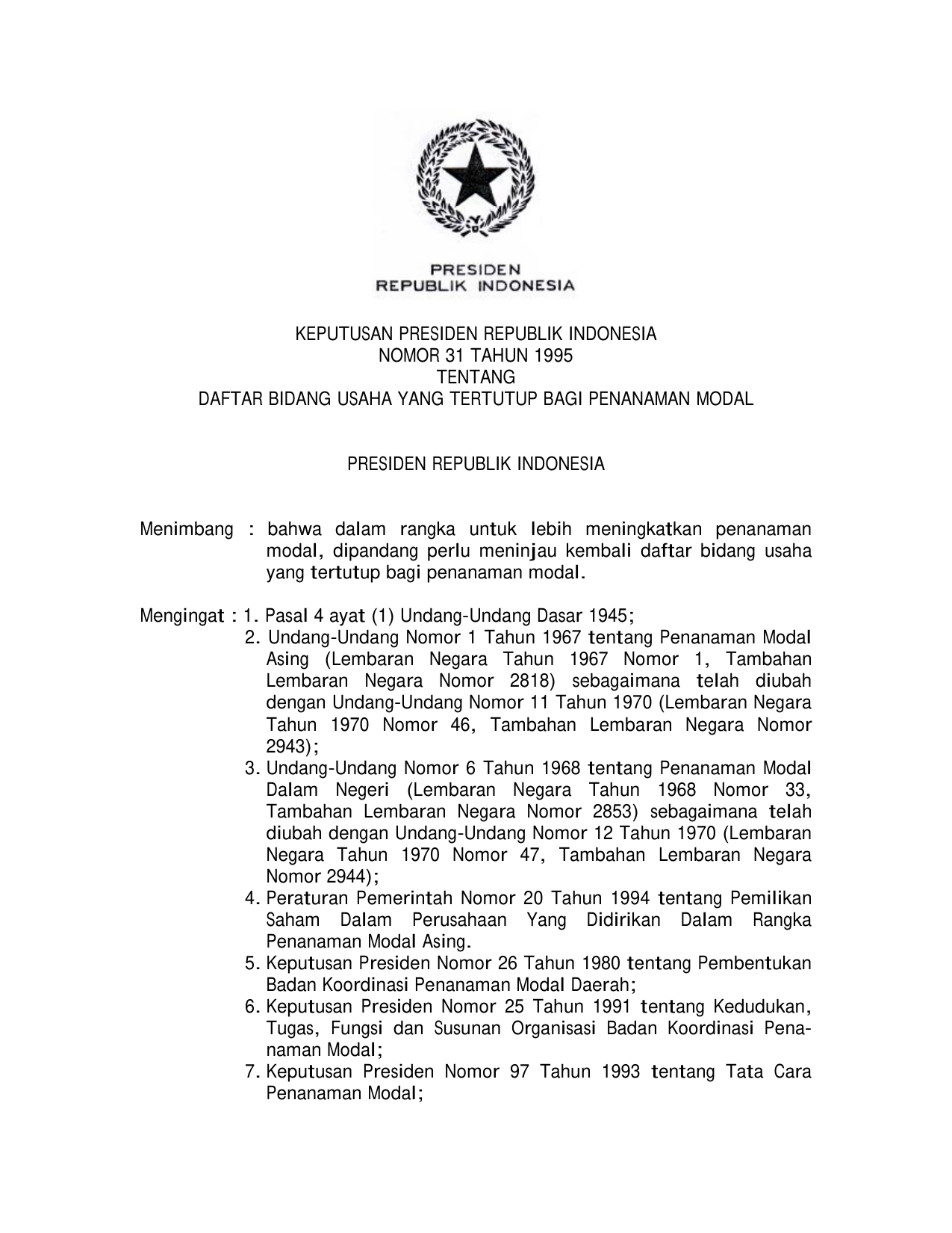 KEPPRES Nomor 31 Tahun 1995 | Keputusan Presiden Nomor 31 Tahun 1995 tentang DAFTAR BIDANG USAHA YANG TERTUTUP BAGI PENANAMAN MODAL