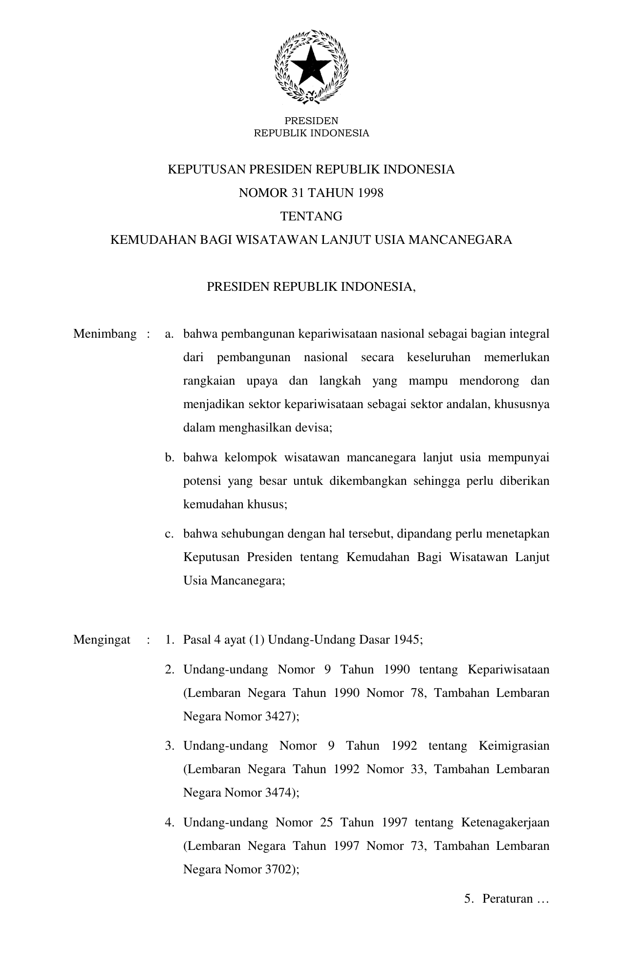 KEPPRES Nomor 31 Tahun 1998 | Keputusan Presiden Nomor 31 Tahun 1998 tentang KEMUDAHAN BAGI WISATAWAN LANJUT USIA MANCA NEGARA