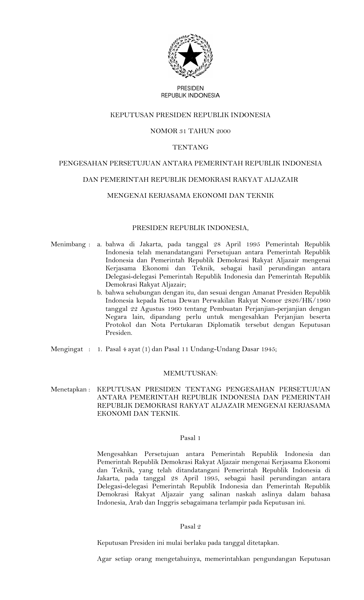 KEPPRES Nomor 31 Tahun 2000 | Keputusan Presiden Nomor 31 Tahun 2000 tentang PENGESAHAN PERSETUJUAN ANTARA PEMERINTAH RI DAN PEMERINTAH REPUBLIK DEMOKRASI RAKYAT ALJAZAIR MENGENAI KERJASAMA EKONOMI DAN TEKNIK