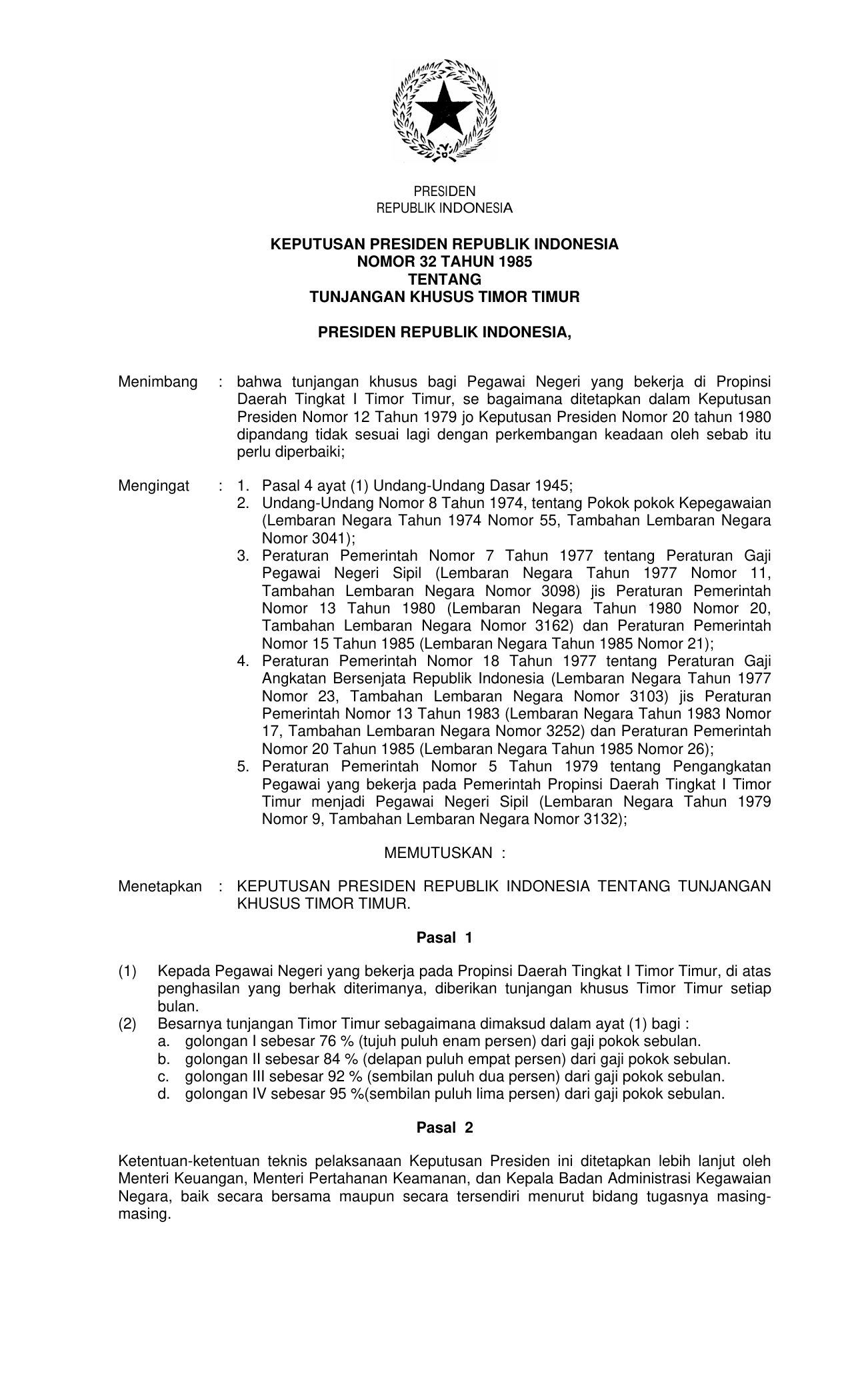 KEPPRES Nomor 32 Tahun 1985 | Keputusan Presiden Nomor 32 Tahun 1985 tentang TUNJANGAN KHUSUS TIMOR TIMUR