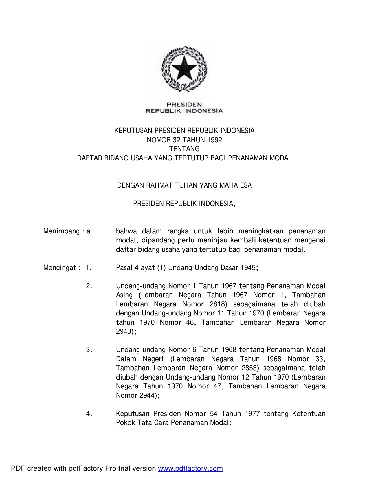 KEPPRES Nomor 32 Tahun 1992 | Keputusan Presiden Nomor 32 Tahun 1992 tentang DAFTAR BIDANG USAHA YANG TERTUTUP BAGI PENANAMAN MODAL