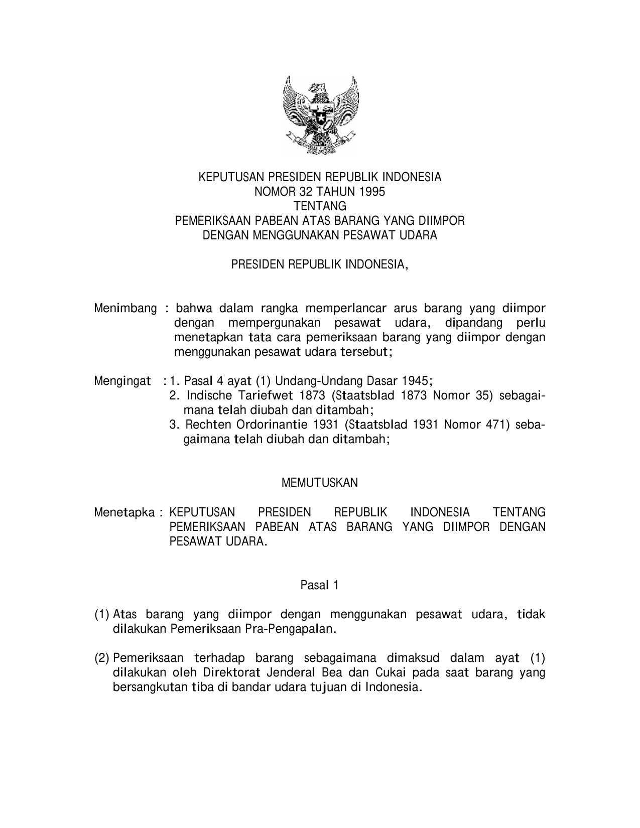 KEPPRES Nomor 32 Tahun 1995 | Keputusan Presiden Nomor 32 Tahun 1995 tentang PEMERIKSAAN PABEAN ATAS BARANG YANG DIIMPOR DENGAN MENGGUNAKAN PESAWAT UDARA