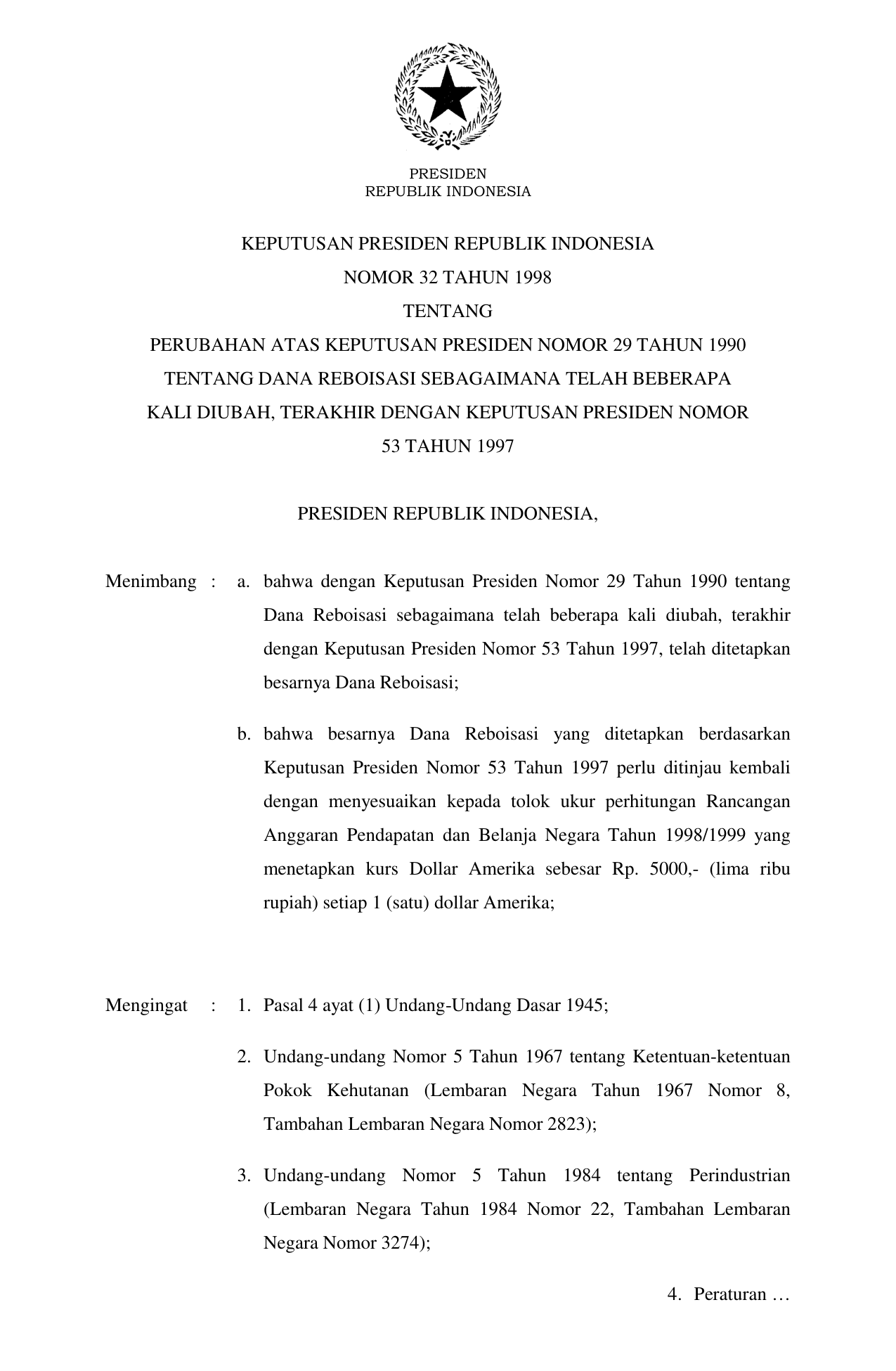 KEPPRES Nomor 32 Tahun 1998 | Keputusan Presiden Nomor 32 Tahun 1998 tentang PERUBAHAN KEPPRES 29-1990 TENTANG DANA REBOISASI SEBAGAIMANA TELAH BEBERAPA KALI DIUBAH TERAKHIR DENGAN KEPPRES 53-1997