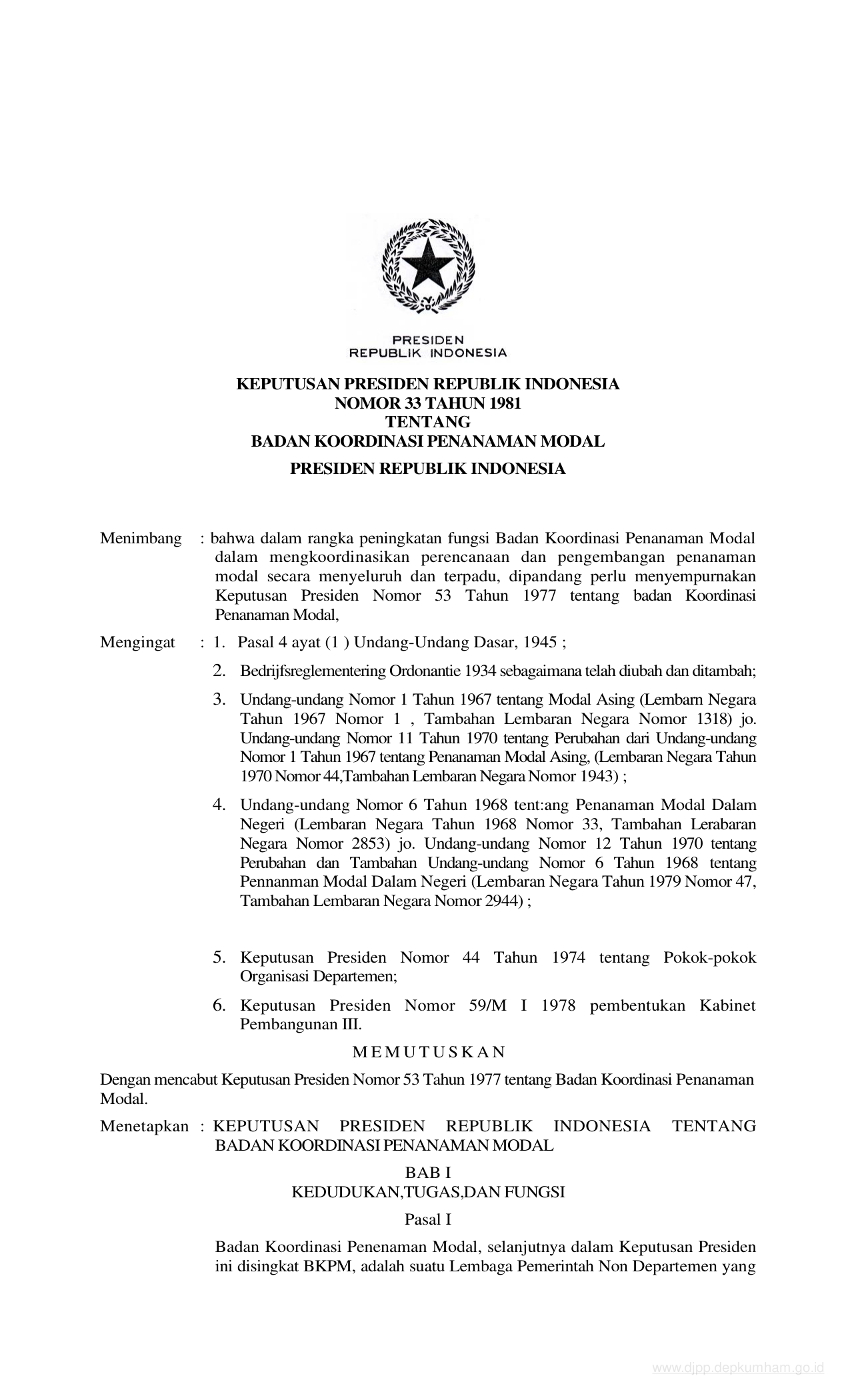 KEPPRES Nomor 33 Tahun 1981 | Keputusan Presiden Nomor 33 Tahun 1981 tentang BADAN KOORDINASI PENANAMAN MODAL