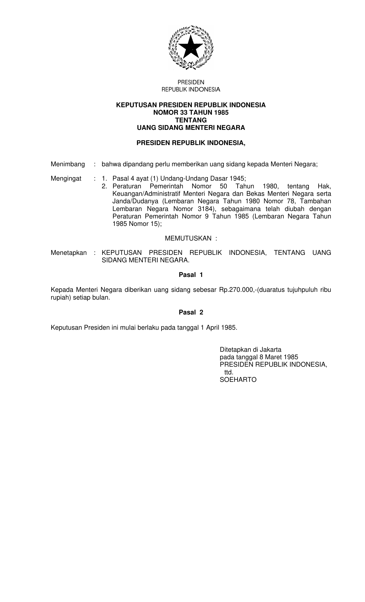 KEPPRES Nomor 33 Tahun 1985 | Keputusan Presiden Nomor 33 Tahun 1985 tentang UANG SIDANG MENTERI NEGARA