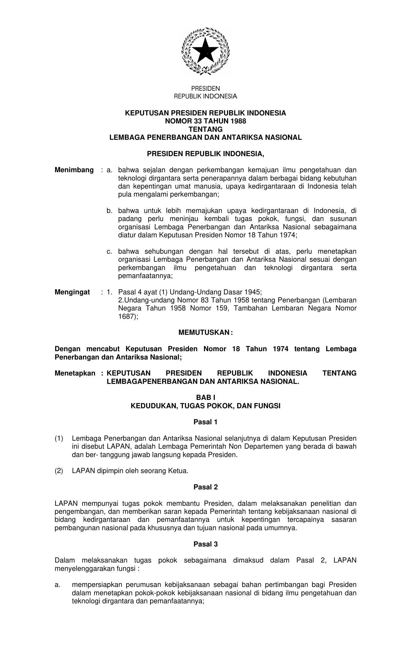 KEPPRES Nomor 33 Tahun 1988 | Keputusan Presiden Nomor 33 Tahun 1988 tentang LEMBAGA PENERBANGAN ANTARIKSA NASIONAL