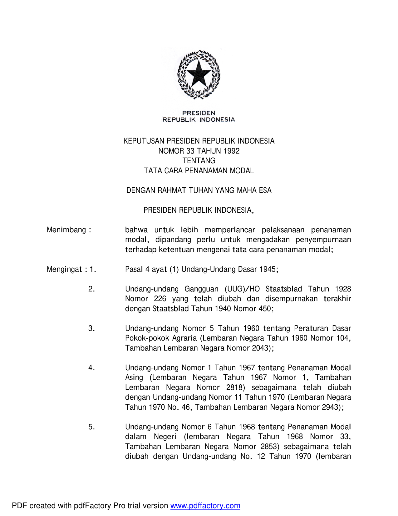 KEPPRES Nomor 33 Tahun 1992 | Keputusan Presiden Nomor 33 Tahun 1992 tentang TATA CARA PENANAMAN MODAL