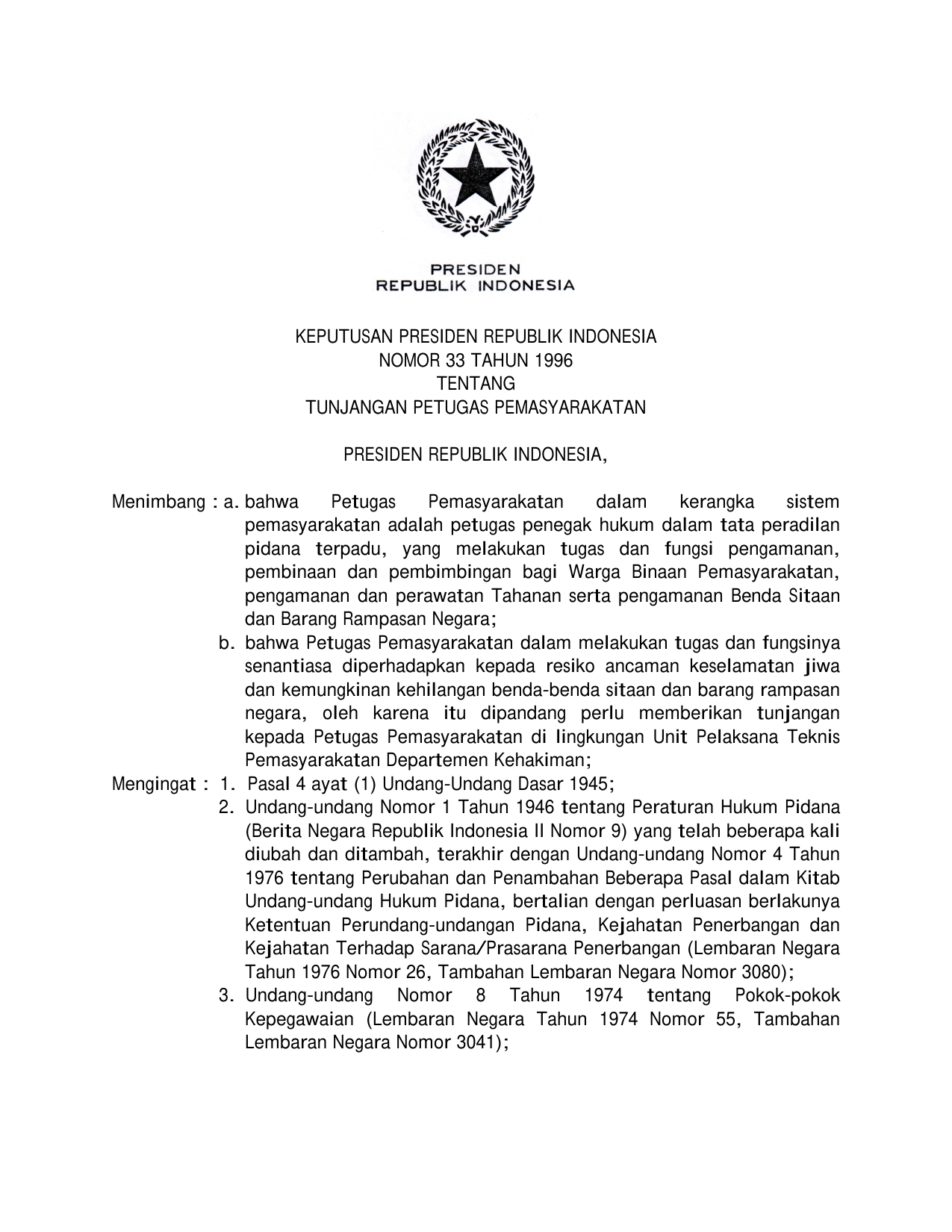 KEPPRES Nomor 33 Tahun 1996 | Keputusan Presiden Nomor 33 Tahun 1996 tentang TUNJANGAN PETUGAS PEMASYARAKATAN