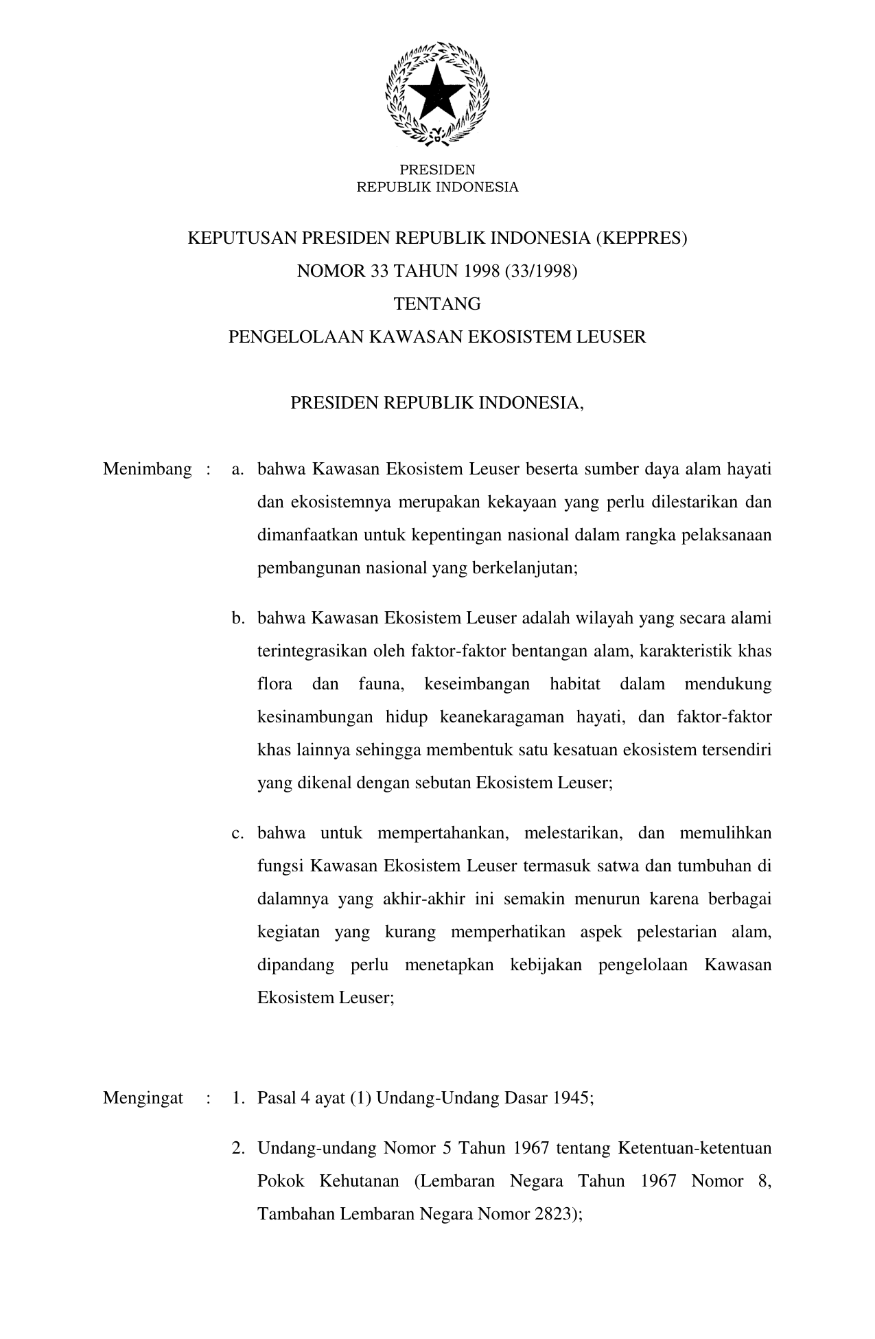 KEPPRES Nomor 33 Tahun 1998 | Keputusan Presiden Nomor 33 Tahun 1998 tentang PENGELOLAAN KAWASAN EKOSISTEM LEUSER