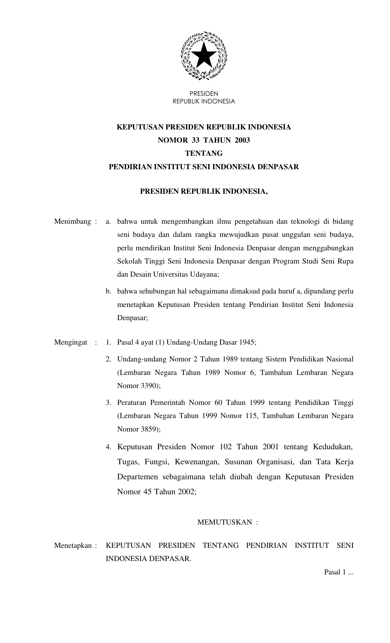 KEPPRES Nomor 33 Tahun 2003 | Keputusan Presiden Nomor 33 Tahun 2003 tentang PENDIRIAN INSTITUT SENI INDONESIA DENPASAR