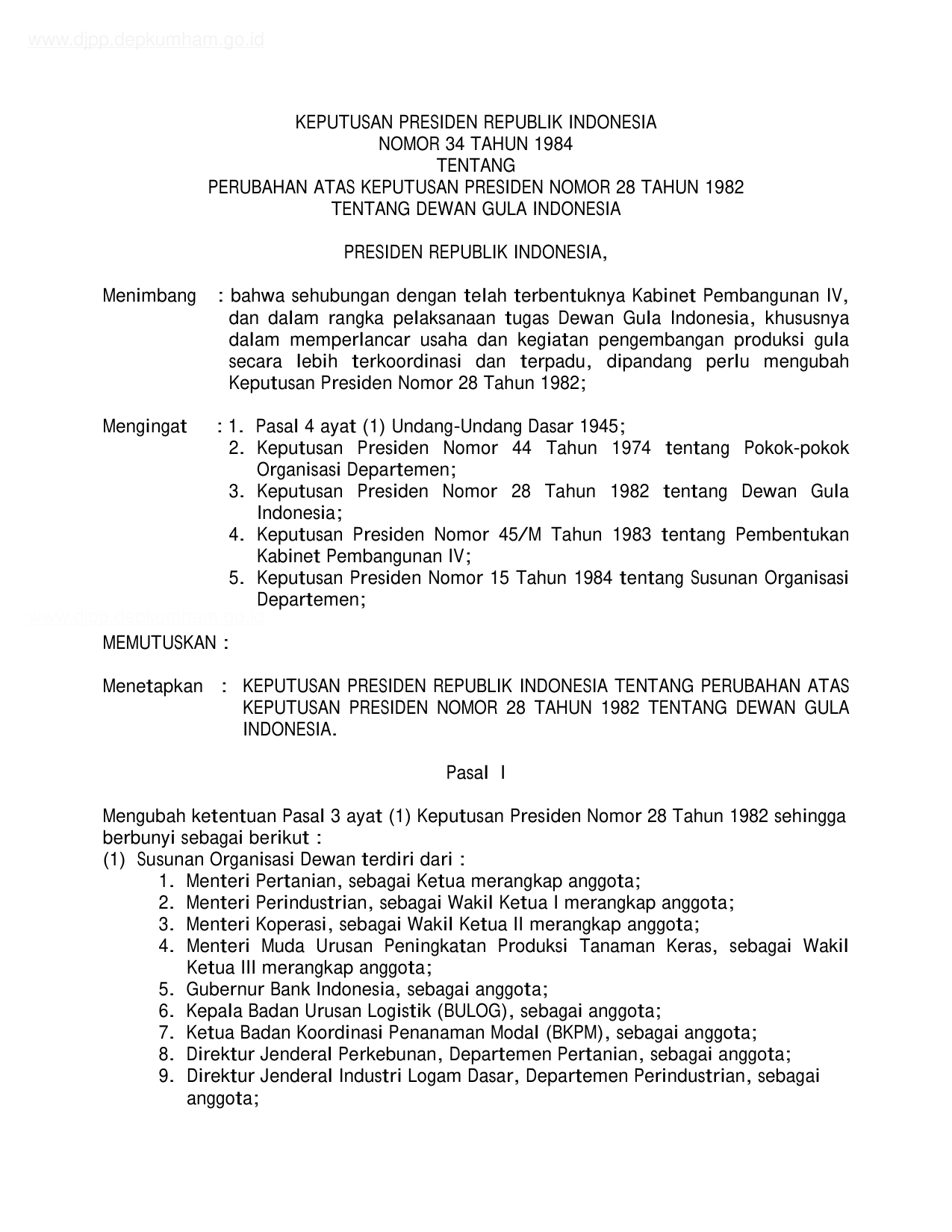 KEPPRES Nomor 34 Tahun 1984 | Keputusan Presiden Nomor 34 Tahun 1984 tentang PERUBAHAN ATAS KEPUTUSAN PRESIDEN NOMOR 28 TAHUN 1982 TENTANG DEWAN GULA INDONESIA