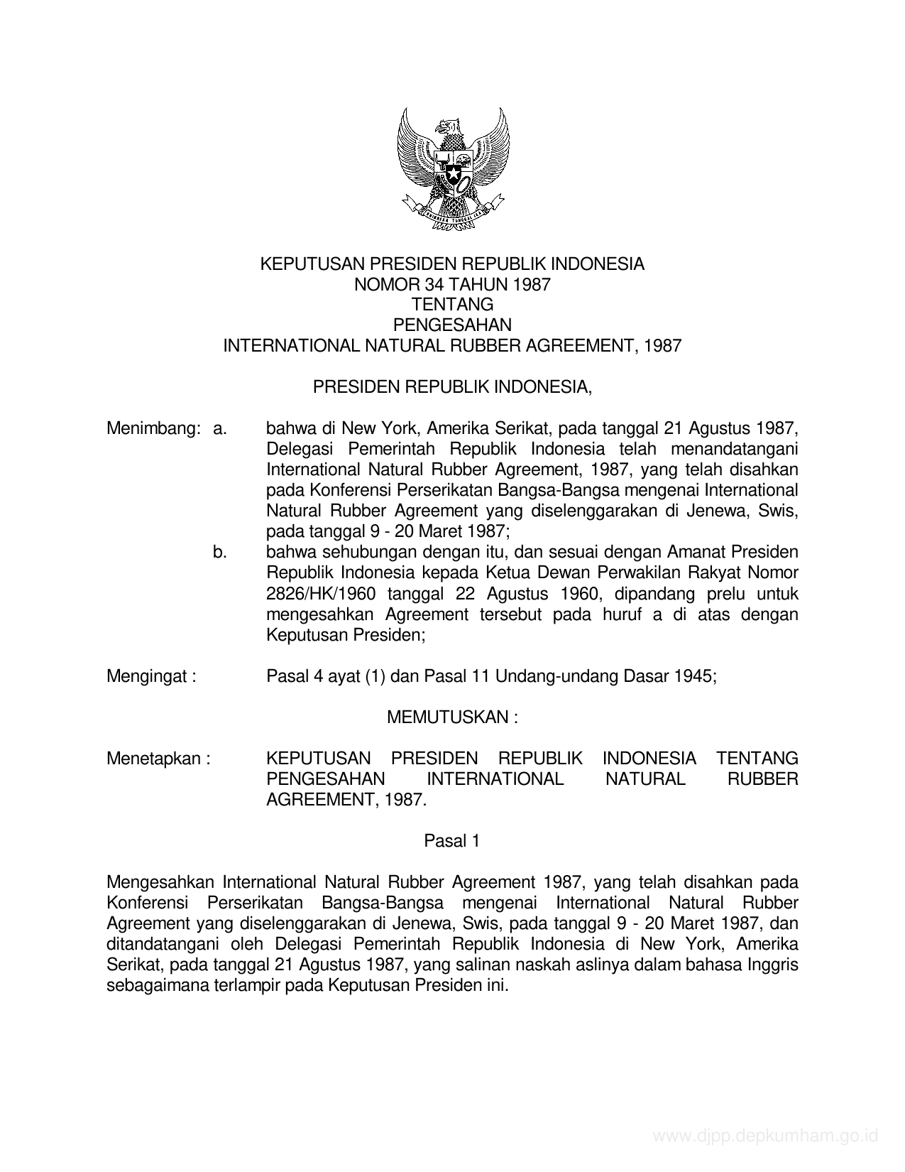 KEPPRES Nomor 34 Tahun 1987 | Keputusan Presiden Nomor 34 Tahun 1987 tentang PENGESAHAN INTERNASIONAL NATURAL RUBBER AGREEMENT, 1987