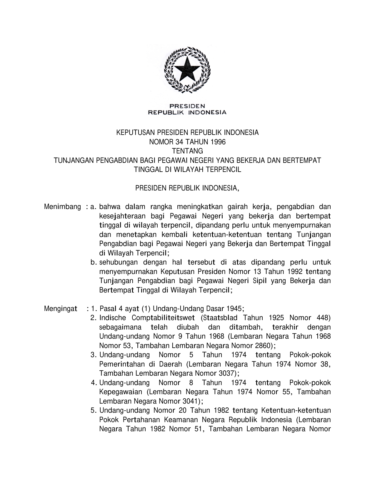 KEPPRES Nomor 34 Tahun 1996 | Keputusan Presiden Nomor 34 Tahun 1996 tentang TUNJANGAN PENGABDIAN BAGI PEGAWAI NEGERI YANG BEKERJA DAN BERTEMPAT TINGGAL DI WILAYAH TERPENCIL