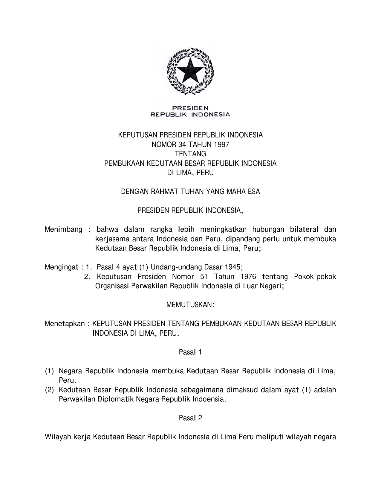 KEPPRES Nomor 34 Tahun 1997 | Keputusan Presiden Nomor 34 Tahun 1997 tentang PEMBUKAAN KEDUTAAN BESAR RI DI LIMA, PERU