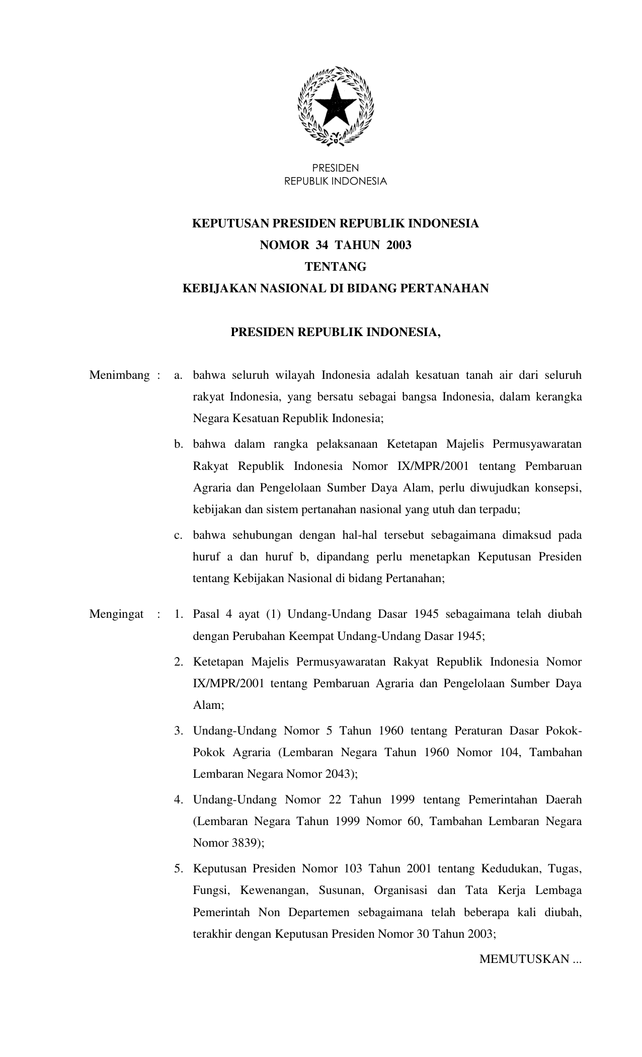 KEPPRES Nomor 34 Tahun 2003 | Keputusan Presiden Nomor 34 Tahun 2003 tentang KEBIJAKAN NASIONAL DI BIDANG PERTANAHAN