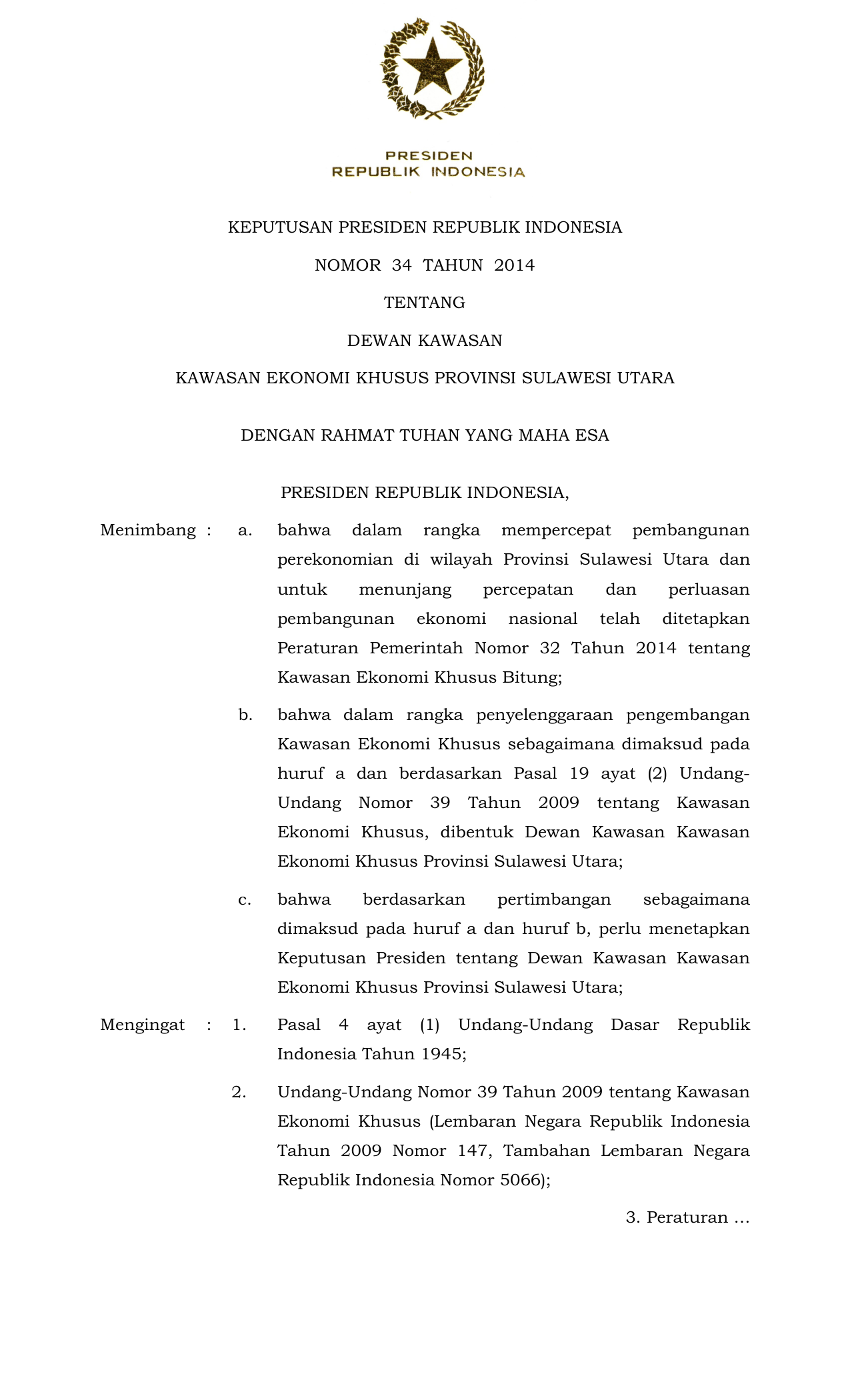 KEPPRES Nomor 34 Tahun 2014 | Keputusan Presiden Nomor 34 Tahun 2014 tentang DEWAN KAWASAN KAWASAN EKONOMI KHUSUS PROVINSI SULAWESI UTARA