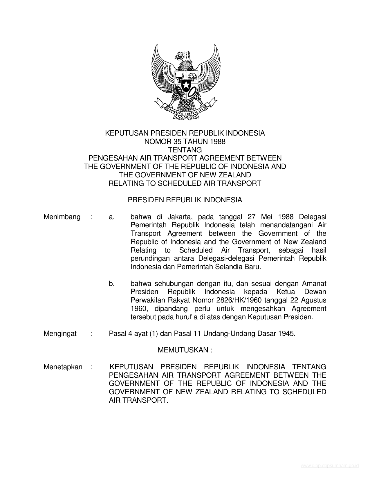 KEPPRES Nomor 35 Tahun 1988 | Keputusan Presiden Nomor 35 Tahun 1988 tentang PENGESAHAN AIR TRANSPORT ANGREEMENT BETWEEN THE GOVERMENT OF THE REPUBLIK OF INDONESIA AND THE GOVERMENT OF NEW ZEALAND RELATING TO SCHEDULED AIR TRANSPORT