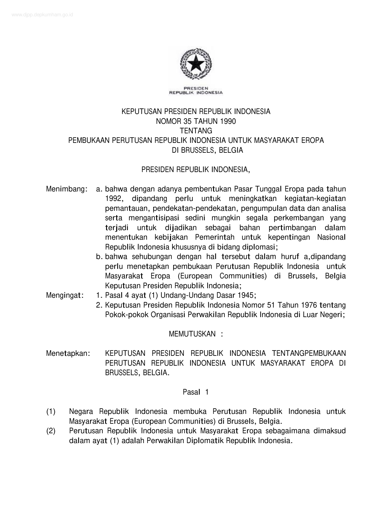 KEPPRES Nomor 35 Tahun 1990 | Keputusan Presiden Nomor 35 Tahun 1990 tentang PEMBUKAAN PERUTUSAN REPUBLIK INDONESIA UNTUK MASYARAKAT EROPA DI BRUSSELS, BELGIA