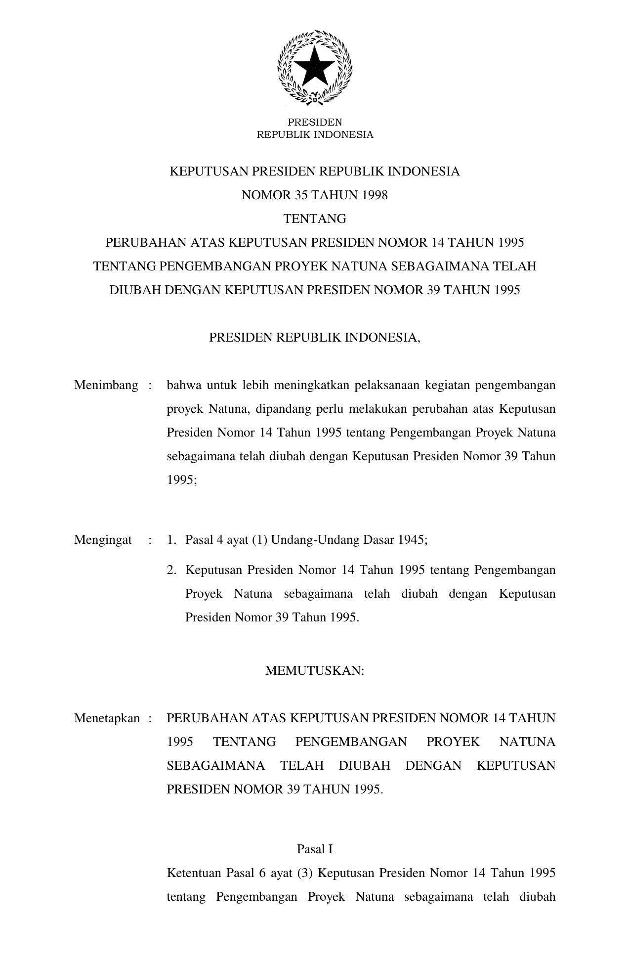 KEPPRES Nomor 35 Tahun 1998 | Keputusan Presiden Nomor 35 Tahun 1998 tentang PERUBAHAN KEPPRES 14-1995 TENTANG PENGEMBANGAN PROYEK NATUNA SEBAGAIMANA TELAH DIUBAH DENGAN KEPPRES 39-1995