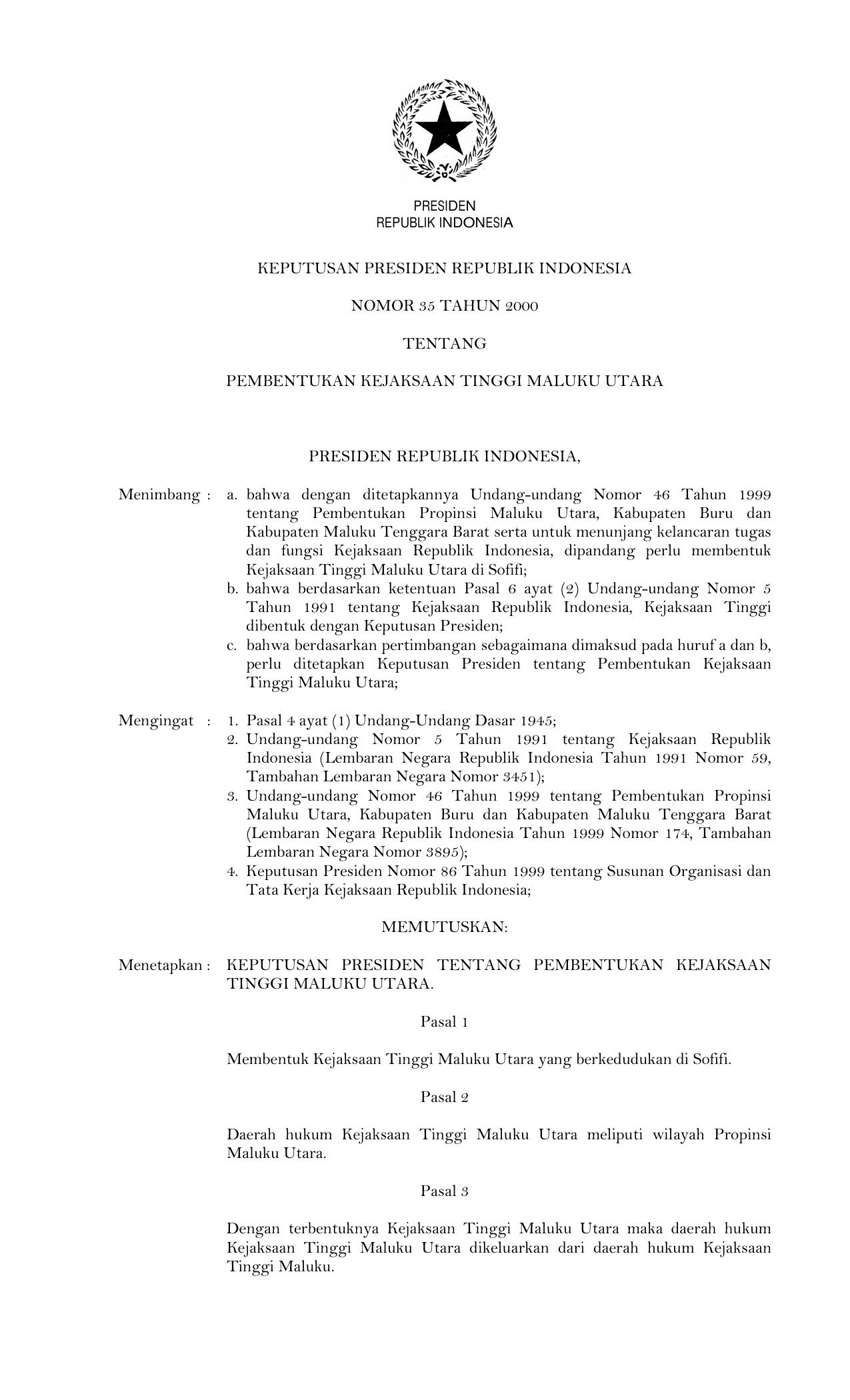 KEPPRES Nomor 35 Tahun 2000 | Keputusan Presiden Nomor 35 Tahun 2000 tentang PEMBENTUKAN KEJAKSAAN TINGGI MALUKU UTARA