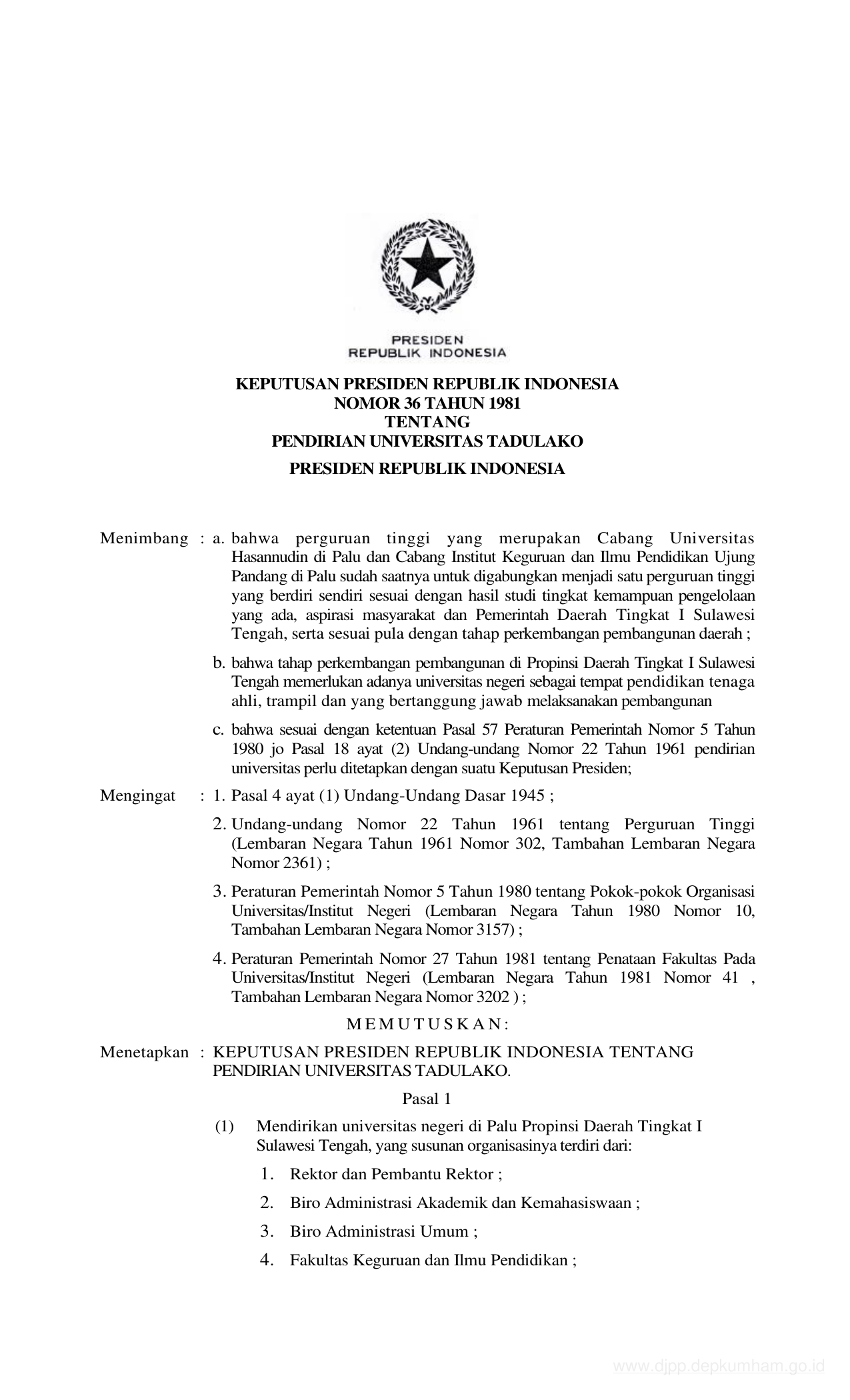 KEPPRES Nomor 36 Tahun 1981 | Keputusan Presiden Nomor 36 Tahun 1981 tentang PENDIRIAN UNIVERSITAS TADUKALO