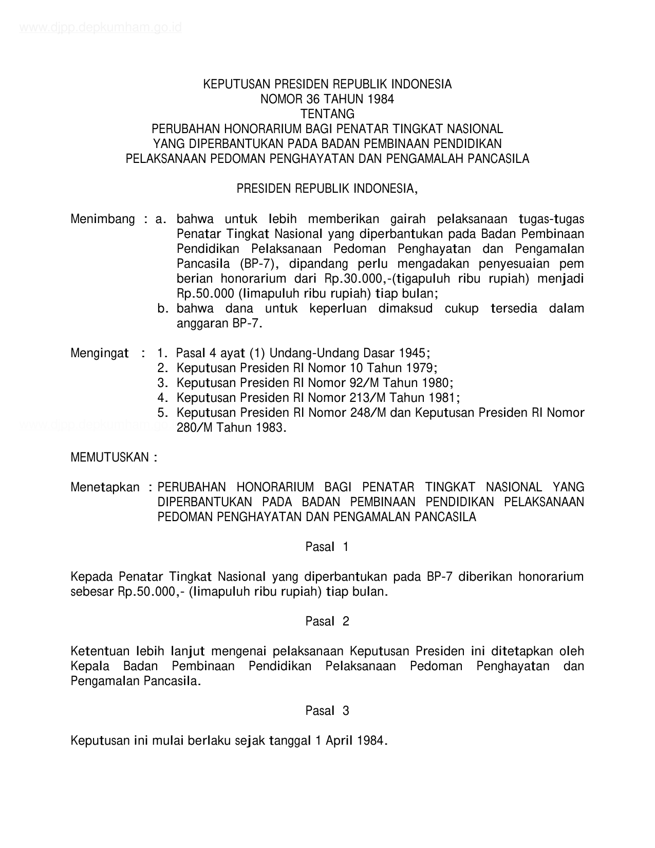 KEPPRES Nomor 36 Tahun 1984 | Keputusan Presiden Nomor 36 Tahun 1984 tentang PERUBAHAN HONORARIUM BAGI PENATA TINGKAT NASIONAL YANG DIPERBANTUKAN PADA BP-7