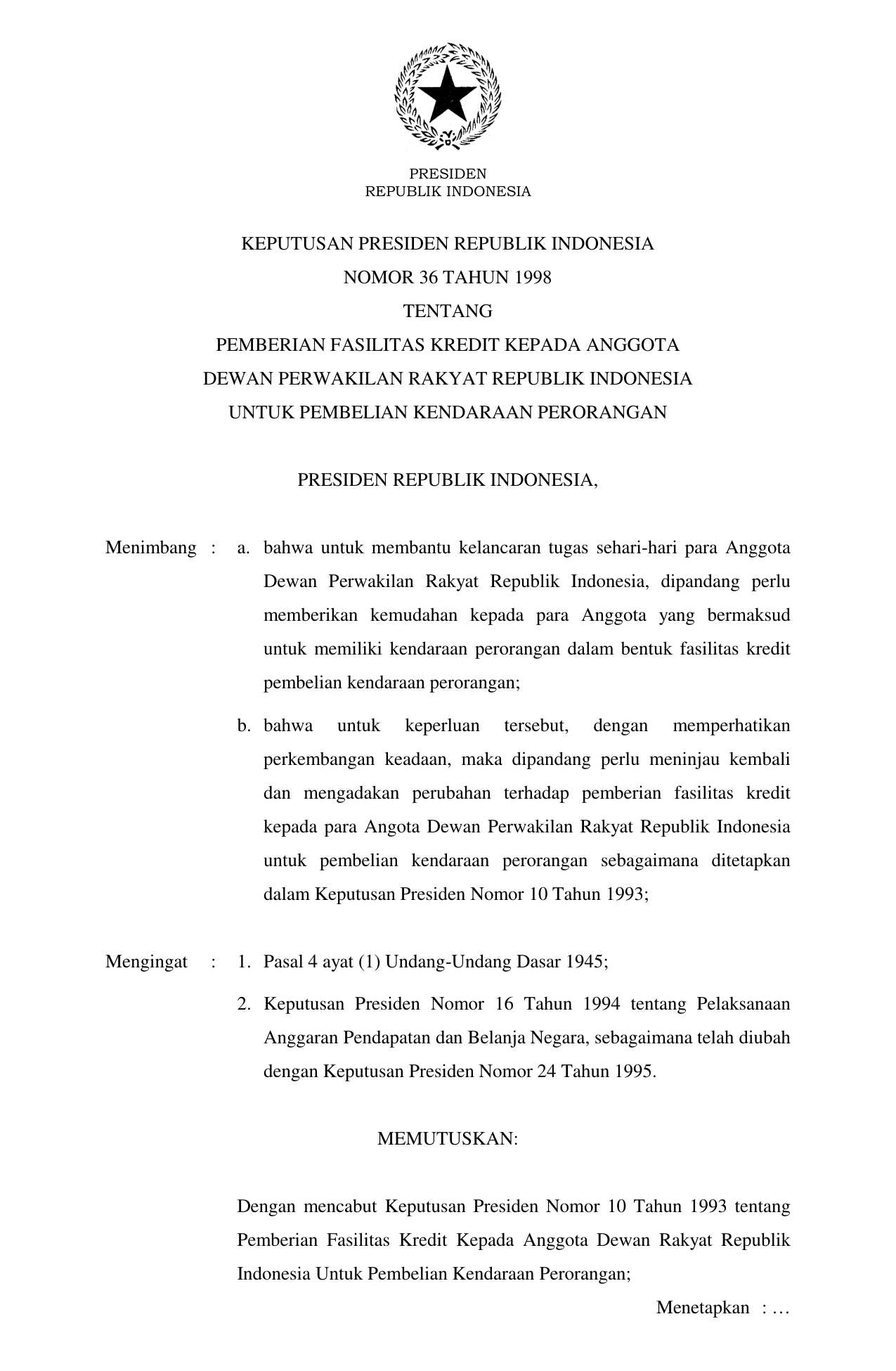 KEPPRES Nomor 36 Tahun 1998 | Keputusan Presiden Nomor 36 Tahun 1998 tentang PEMBERIAN FASILITAS KREDIT KEPADA ANGGOTA DEWAN PERWAKILAN RAKYA RI UNTUK PEMBELIAN KENDARAAN PERORANGAN