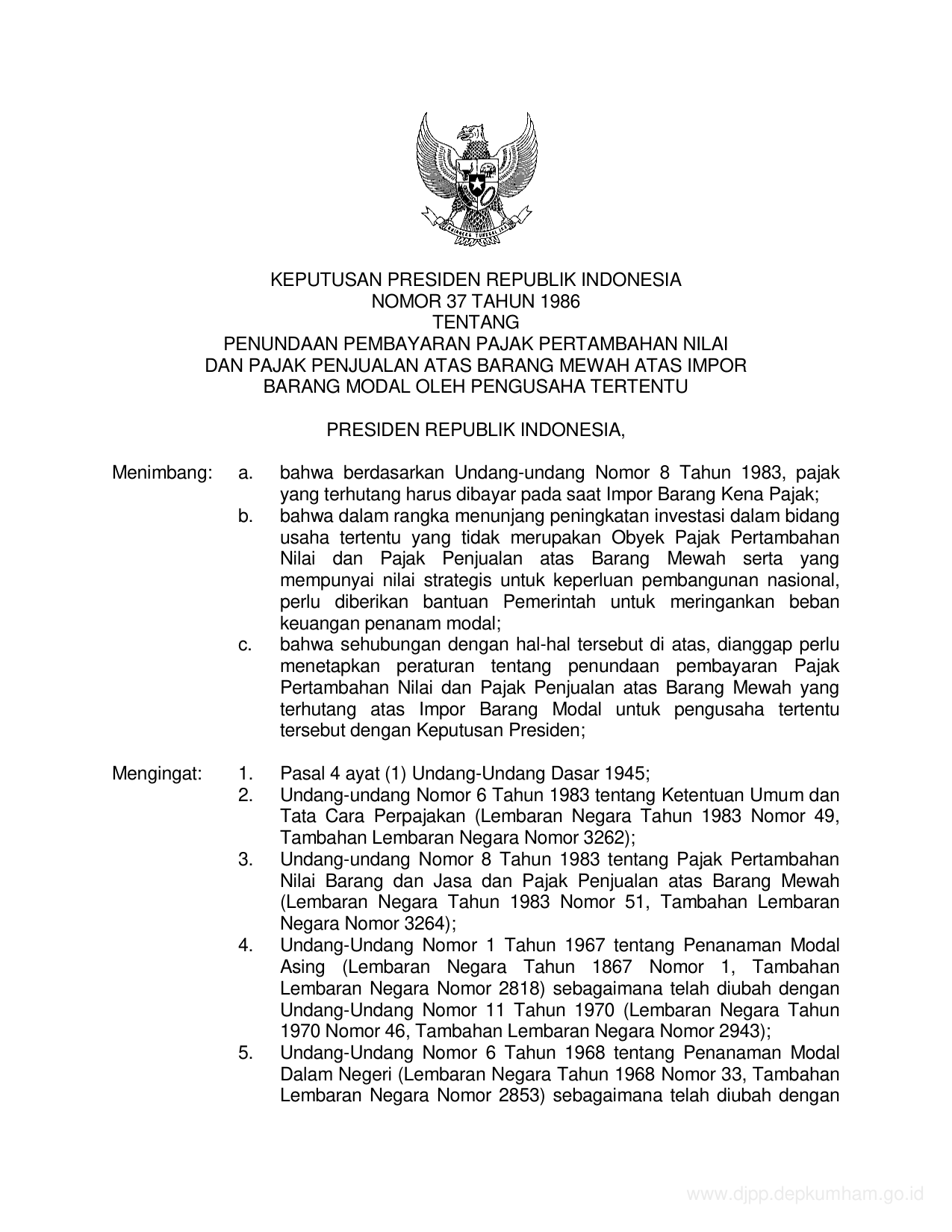 KEPPRES Nomor 37 Tahun 1986 | Keputusan Presiden Nomor 37 Tahun 1986 tentang PENUNDAAN PEMBAYARAN PAJAK PERTAMBAHAN NILAI DAN PAJAK PENJUALAN ATAS BARANG MEWAH, ATAS IMPOR BARANG MODAL OLEH PENGUSAHA TERTENTU