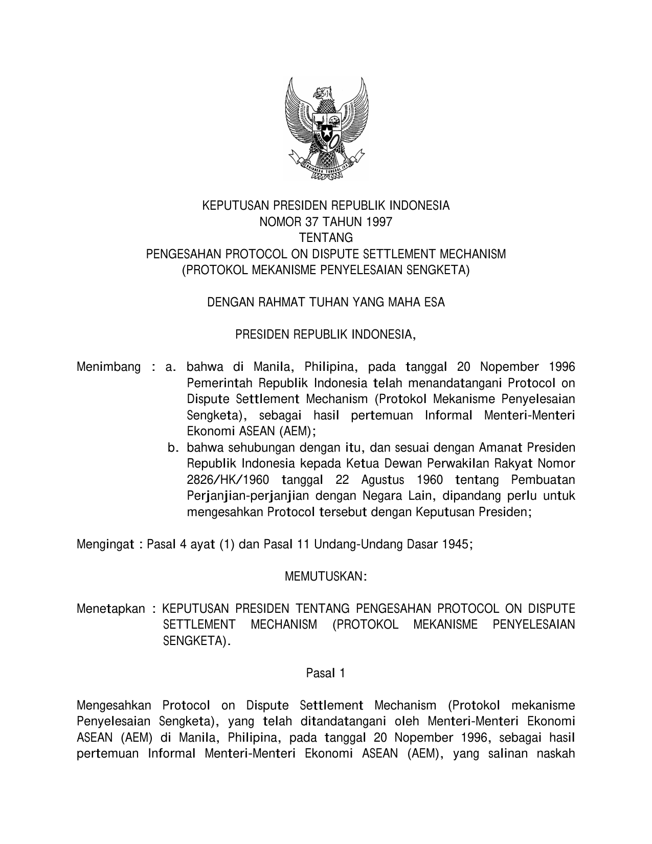 KEPPRES Nomor 37 Tahun 1997 | Keputusan Presiden Nomor 37 Tahun 1997 tentang PENGESAHAN PROTOCOL DISPUTE SETTLEMENT MECHANISM (PROTOKOL MEKANISME PENYELESAIAN SENGKETA)
