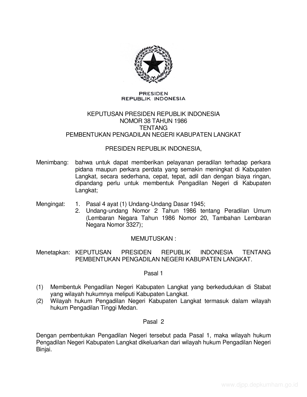 KEPPRES Nomor 38 Tahun 1986 | Keputusan Presiden Nomor 38 Tahun 1986 tentang PEMBENTUKAN PENGADILAN NEGERI KABUPATEN LANGKAT