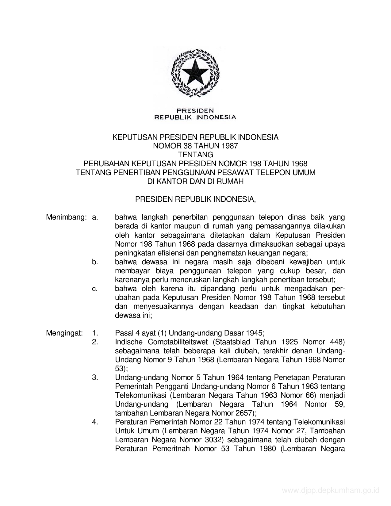 KEPPRES Nomor 38 Tahun 1987 | Keputusan Presiden Nomor 38 Tahun 1987 tentang PERUBAHAN KEPUTUSAN PRESIDEN NOMOR 198 TAHUN 1968 TENTANG PENERTIBAN PENGGUNAAN PESAWAT TELEPON UMUM DI KANTOR DAN DI RUMAH