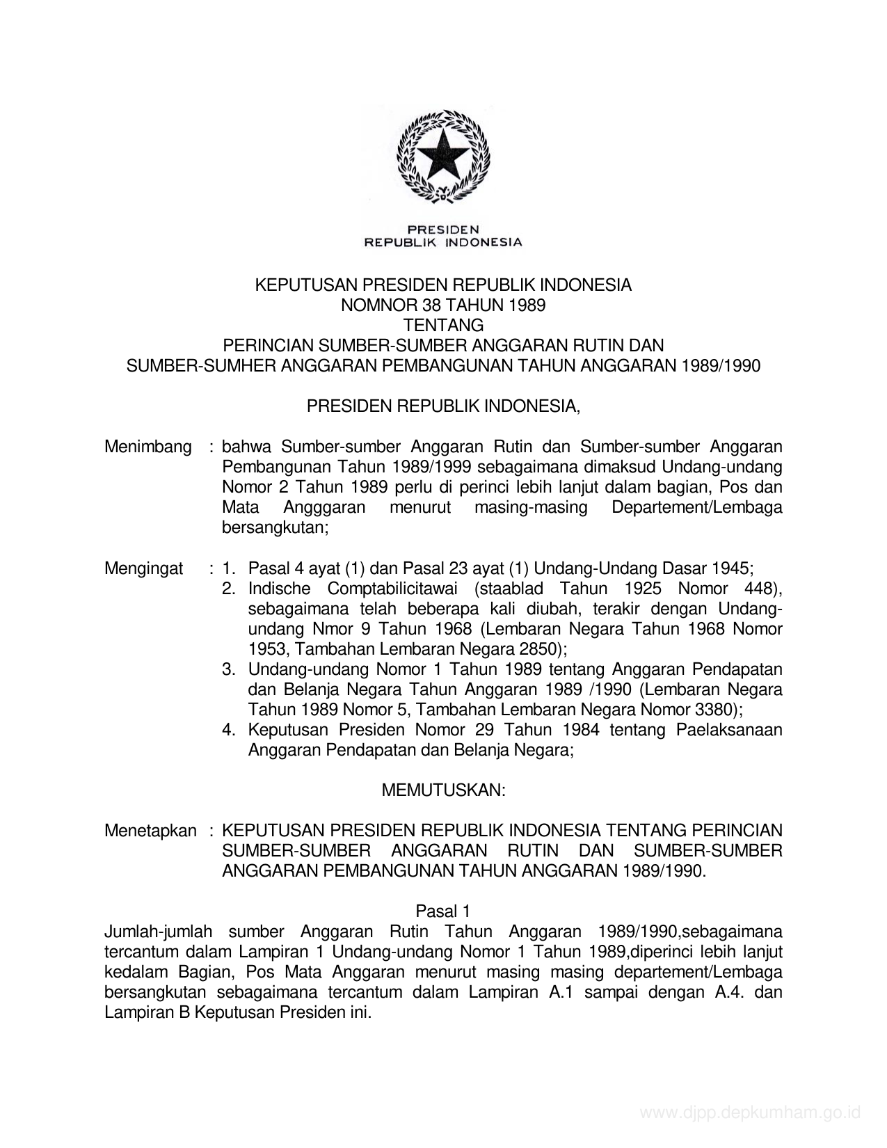 KEPPRES Nomor 38 Tahun 1989 | Keputusan Presiden Nomor 38 Tahun 1989 tentang PERINCIN SUMBER-SUMBER ANGGARAN RUTIN DAN SUMBER-SUMBER ANGGARAN PEMBANGUNAN TAHUN ANGGARAN 1989/1990
