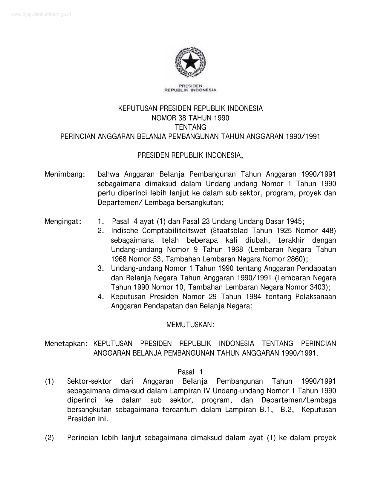 KEPPRES Nomor 38 Tahun 1990 | Keputusan Presiden Nomor 38 Tahun 1990 tentang PERINCIAN ANGGARAN BELANJA PEMBANGUNAN TAHUN ANGGARAN 1990/1991