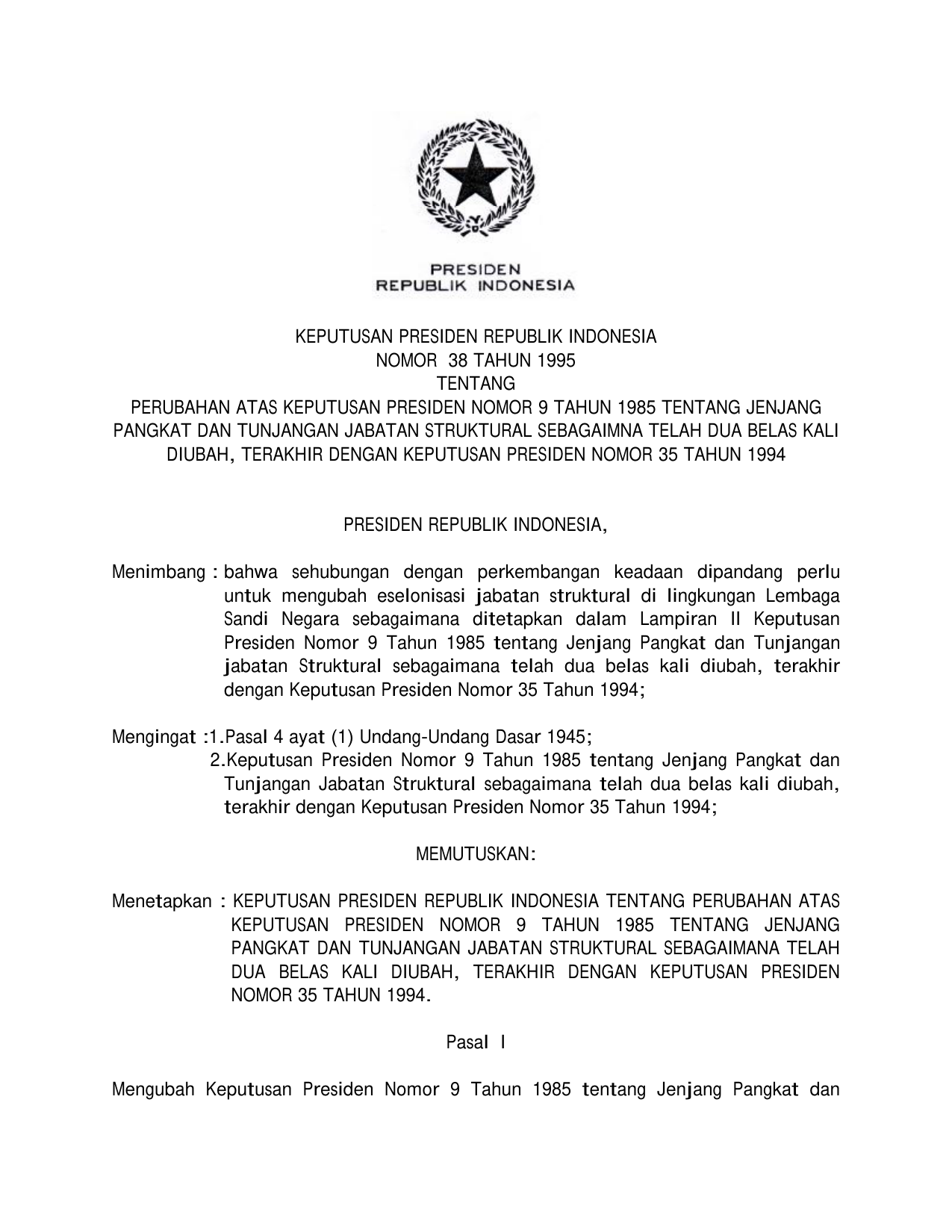 KEPPRES Nomor 38 Tahun 1995 | Keputusan Presiden Nomor 38 Tahun 1995 tentang PERUBAHAN KEPPRES 9-1985 TENTANG JENJANG PANGKAT DAN TUNJANGAN JABATAN STRUKTURAL SEBAGAIMANA TELAH 12 KALI DIUBAH, TERAKHIR DENGAN KEPPRES 35-1994