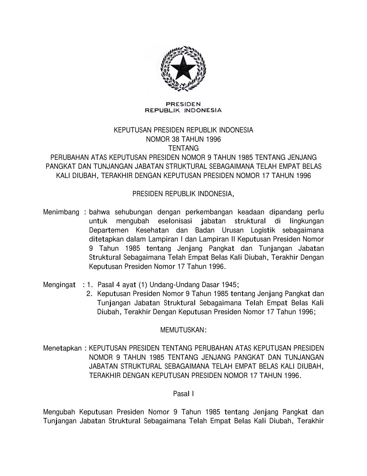 KEPPRES Nomor 38 Tahun 1996 | Keputusan Presiden Nomor 38 Tahun 1996 tentang PERUBAHAN KEPPRES 9-1985 TENTANG JENJANG PANGKAT DAN TUNJANGAN JABATAN STRUKTURAL SEBAGAIMANA TELAH EMPAT BELAS KALI DIUBAH, TERAKHIR DENGAN KEPPRES 17-1996