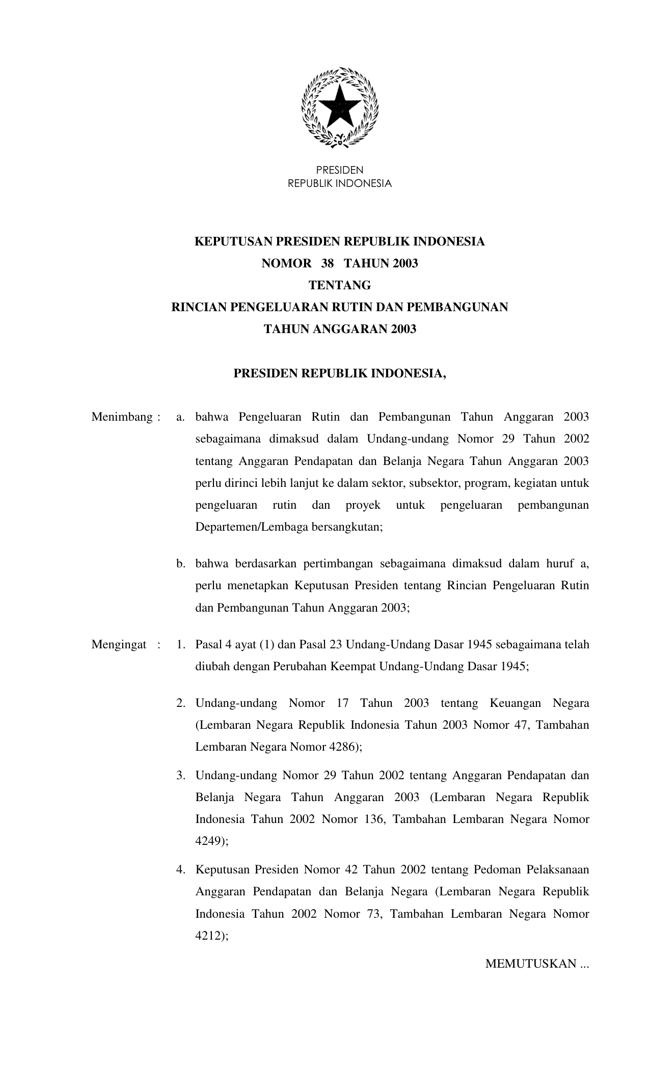 KEPPRES Nomor 38 Tahun 2003 | Keputusan Presiden Nomor 38 Tahun 2003 tentang RINCIAN PENGELUARAN RUTIN DAN PEMBANGUNAN TAHUN ANGGARAN 2003